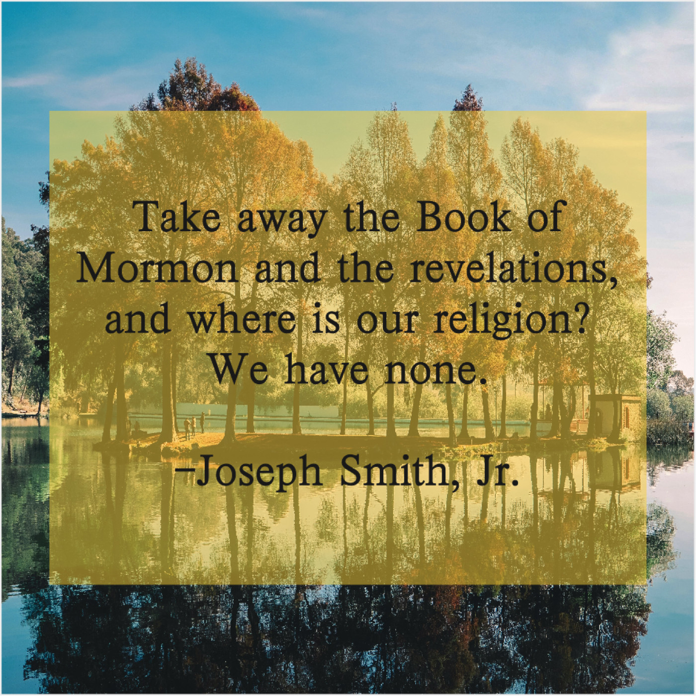 Joseph Smith, Jr. Joseph Smith, Jr. – Take away the Book of… February 12, 2019 admin “Take away the Book of Mormon and the revelations, and where is our religion? We have none.”-Joseph Smith, Jr.