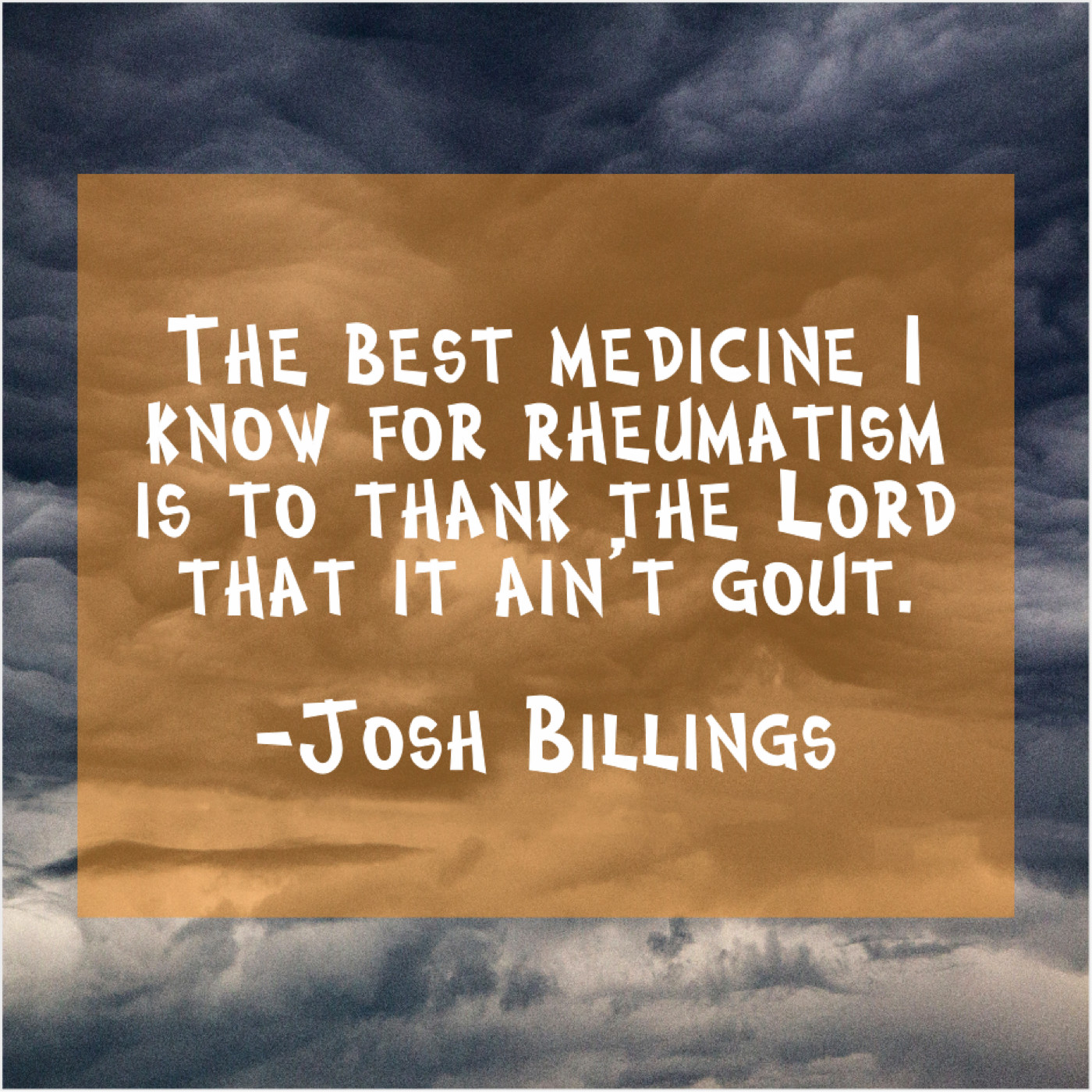 Josh Billings Josh Billings – The best medicine I know… January 10, 2019 admin “The best medicine I know for rheumatism is to thank the Lord that it ain’t gout.”-Josh Billings