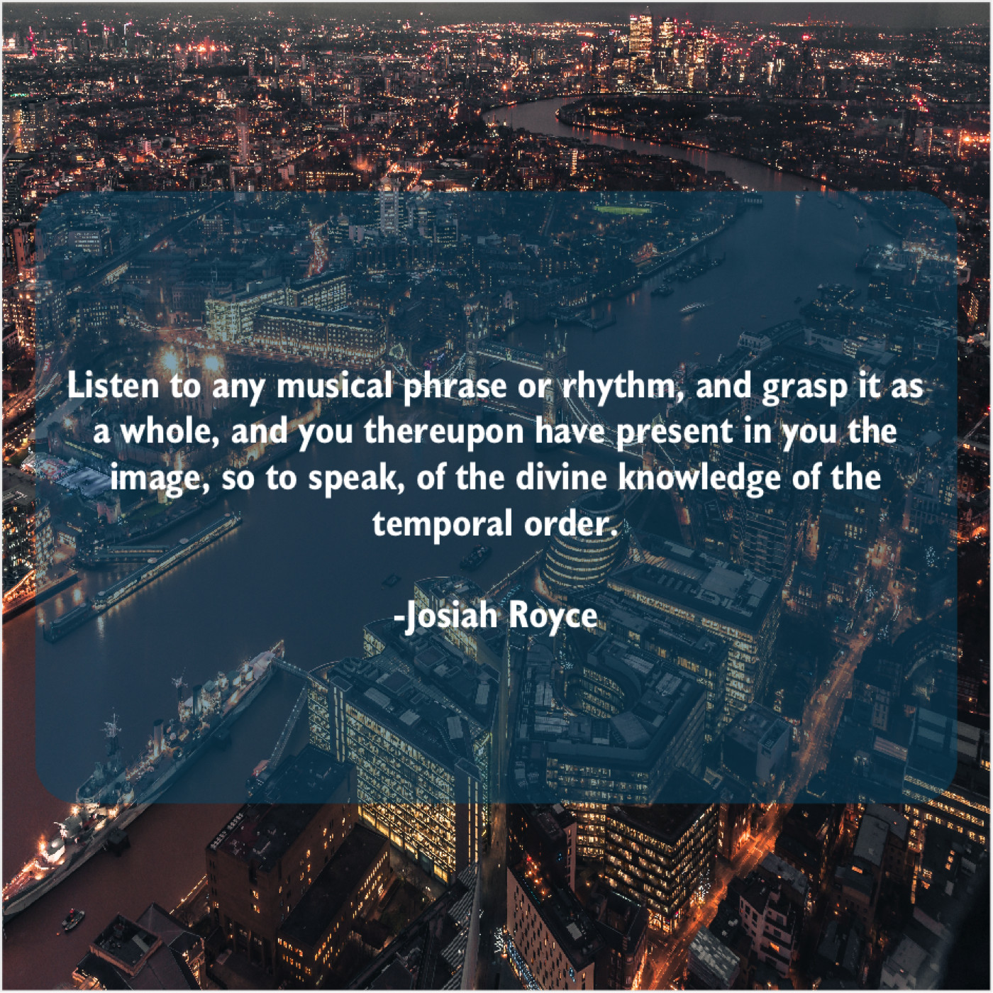 Josiah Royce Josiah Royce – Listen to any musical phrase… November 23, 2018 admin “Listen to any musical phrase or rhythm, and grasp it as a whole, and you thereupon have present in you the image, so to speak, of the divine knowledge of the temporal order.”-Josiah Royce