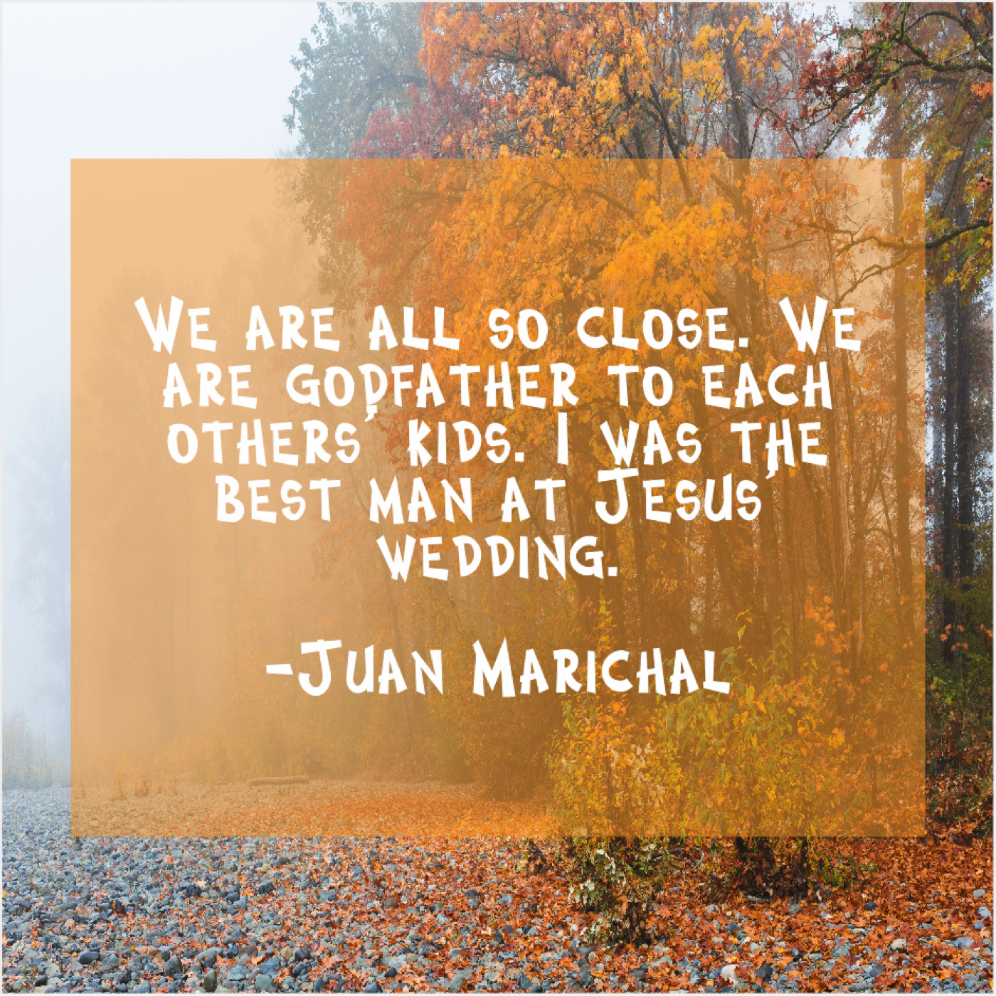 Juan Marichal Juan Marichal – We are all so close… November 18, 2018 admin “We are all so close. We are godfather to each others’ kids. I was the best man at Jesus’ wedding.”-Juan Marichal