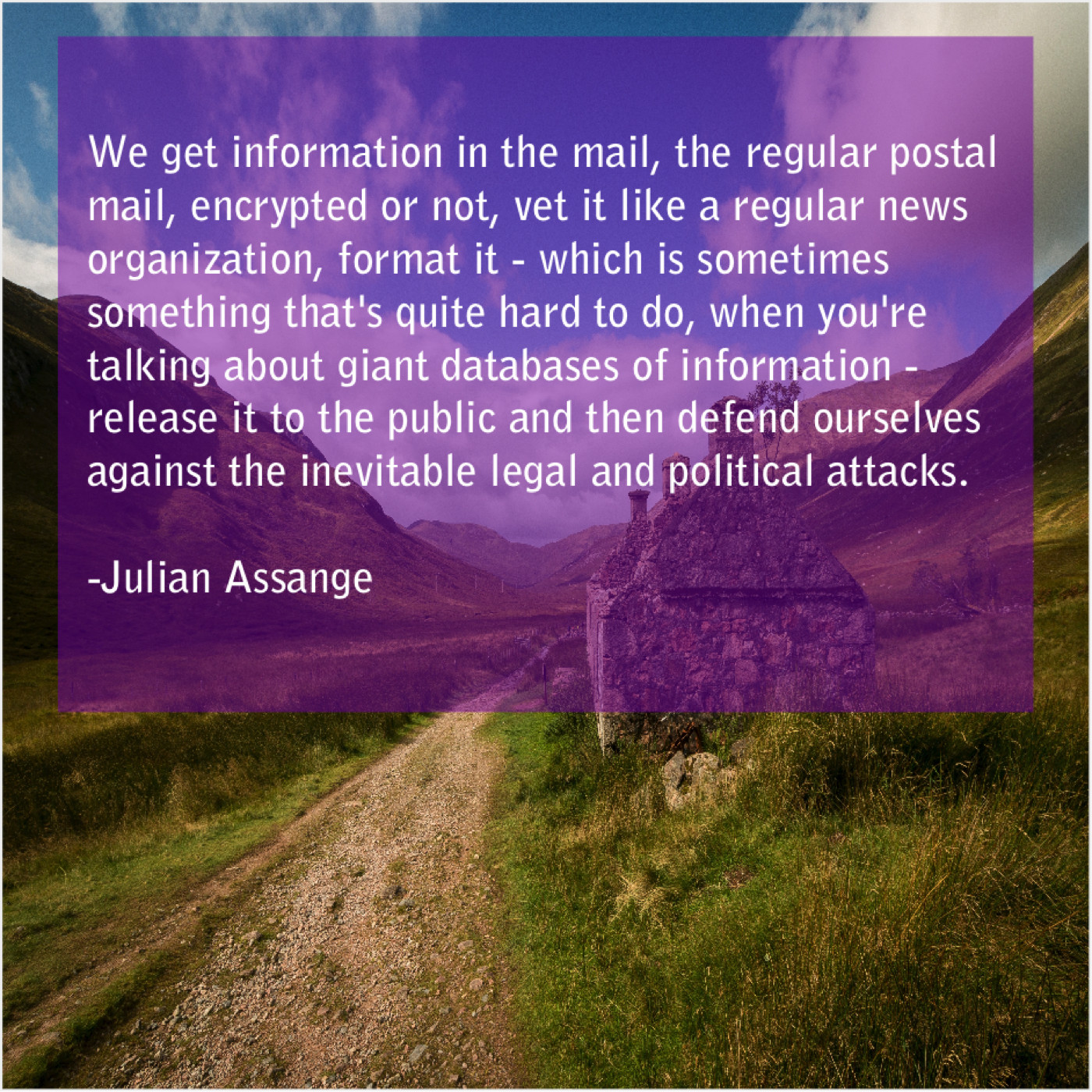 “We get information in the mail, the regular postal mail, encrypted or not, vet it like a regular news organization, format it – which is sometimes something that’s quite hard to do, when you’re talking about giant databases of information – release it to the public and then defend ourselves against the inevitable legal and political attacks.”