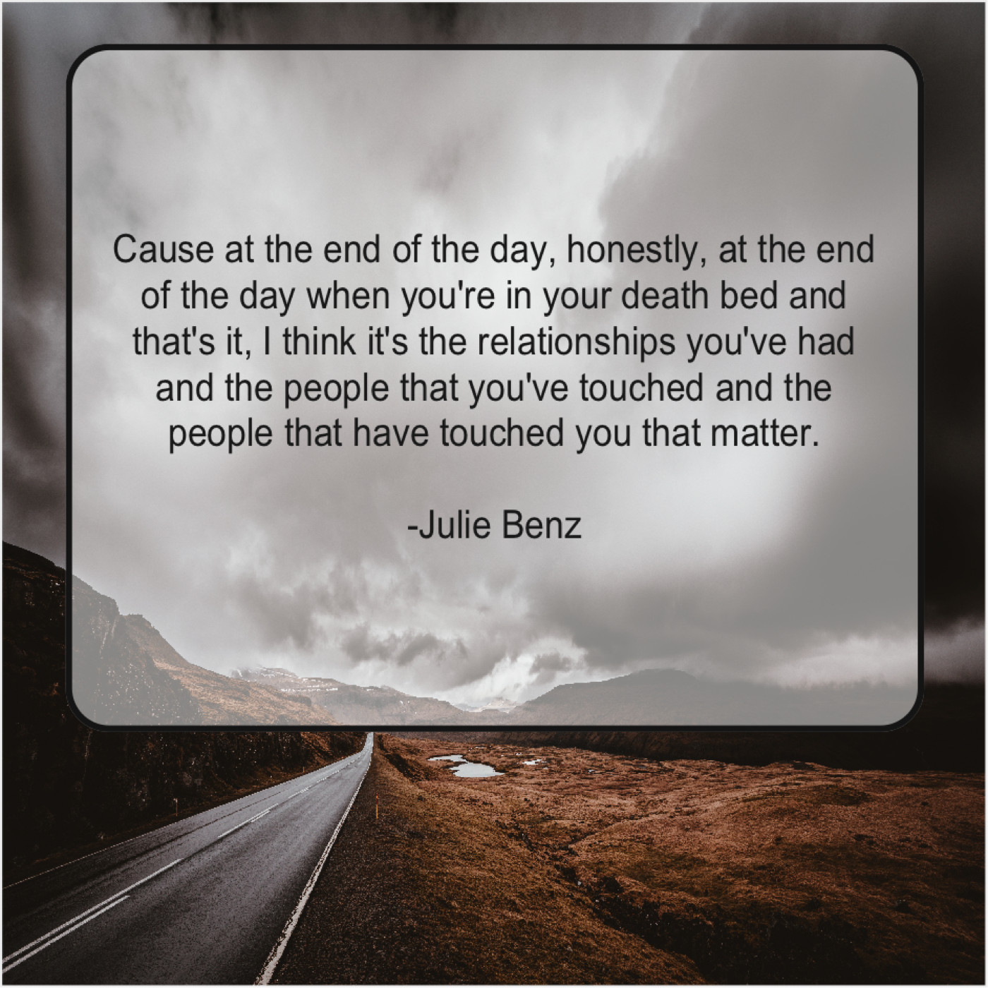 Julie Benz Julie Benz – Cause at the end of… October 15, 2019 admin “Cause at the end of the day, honestly, at the end of the day when you’re in your death bed and that’s it, I think it’s the relationships you’ve had and the people that you’ve touched and the people that have touched you that matter.”-Julie Benz