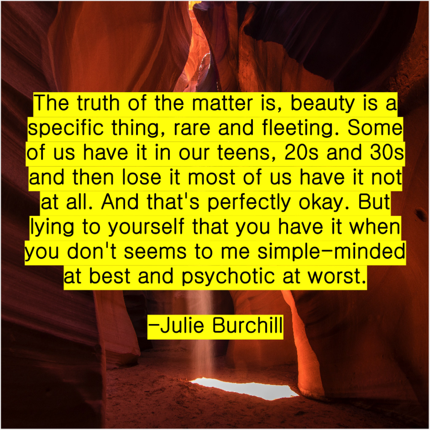 “The truth of the matter is, beauty is a specific thing, rare and fleeting. Some of us have it in our teens, 20s and 30s and then lose it most of us have it not at all. And that’s perfectly okay. But lying to yourself that you have it when you don’t seems to me simple-minded at best and psychotic at worst.”
