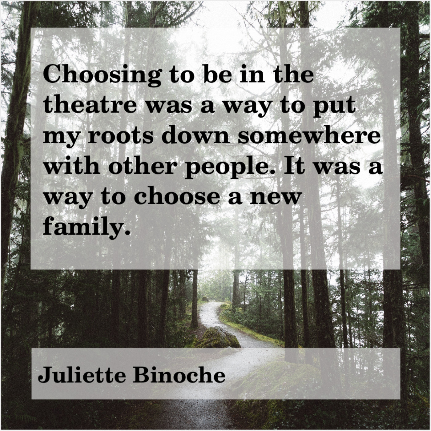 Juliette Binoche Juliette Binoche – Choosing to be in the… April 2, 2019 admin “Choosing to be in the theatre was a way to put my roots down somewhere with other people. It was a way to choose a new family.”-Juliette Binoche