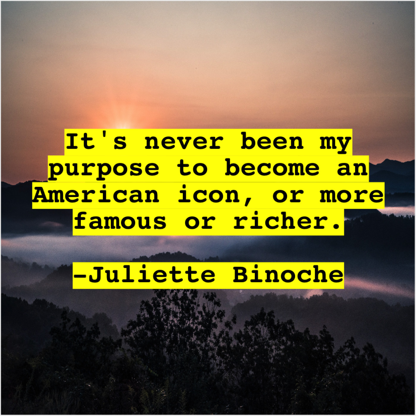 Juliette Binoche Juliette Binoche – It’s never been my purpose… May 13, 2019 admin “It’s never been my purpose to become an American icon, or more famous or richer.”-Juliette Binoche