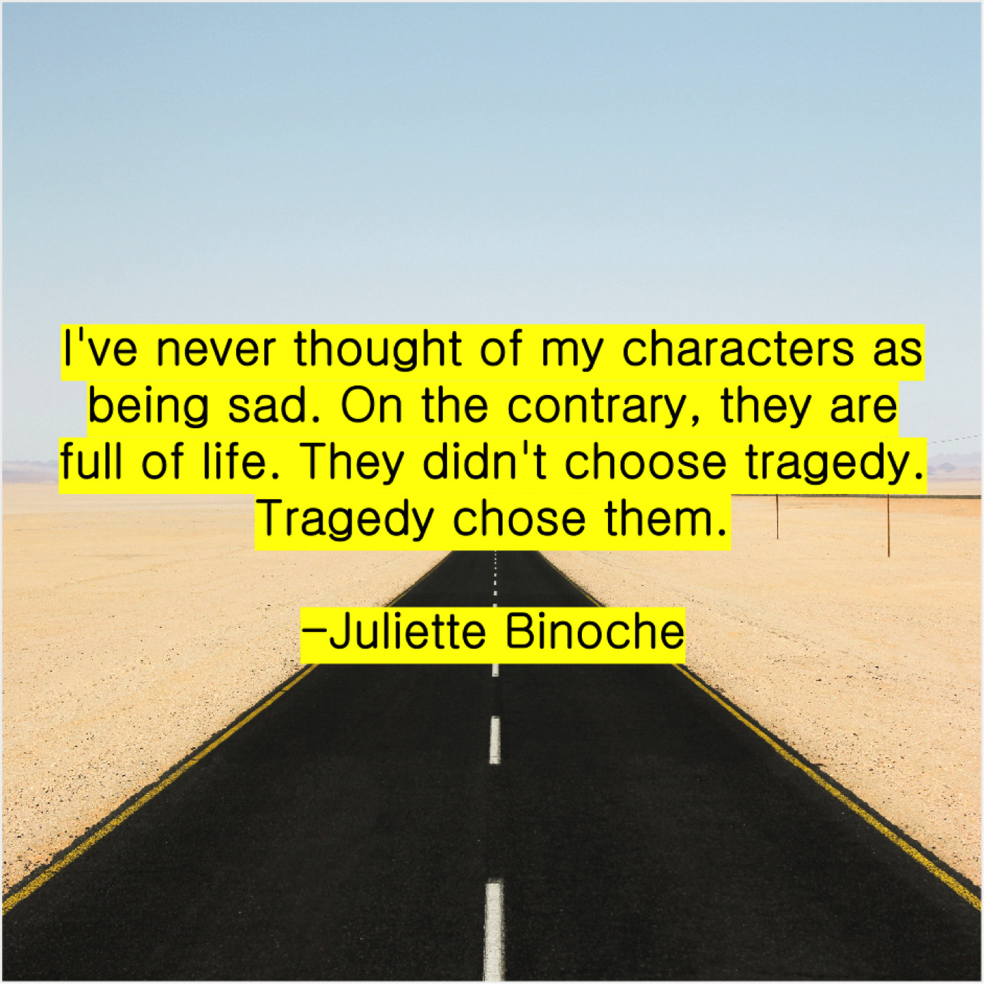 Juliette Binoche Juliette Binoche – I’ve never thought of my… May 10, 2019 admin “I’ve never thought of my characters as being sad. On the contrary, they are full of life. They didn’t choose tragedy. Tragedy chose them.”-Juliette Binoche