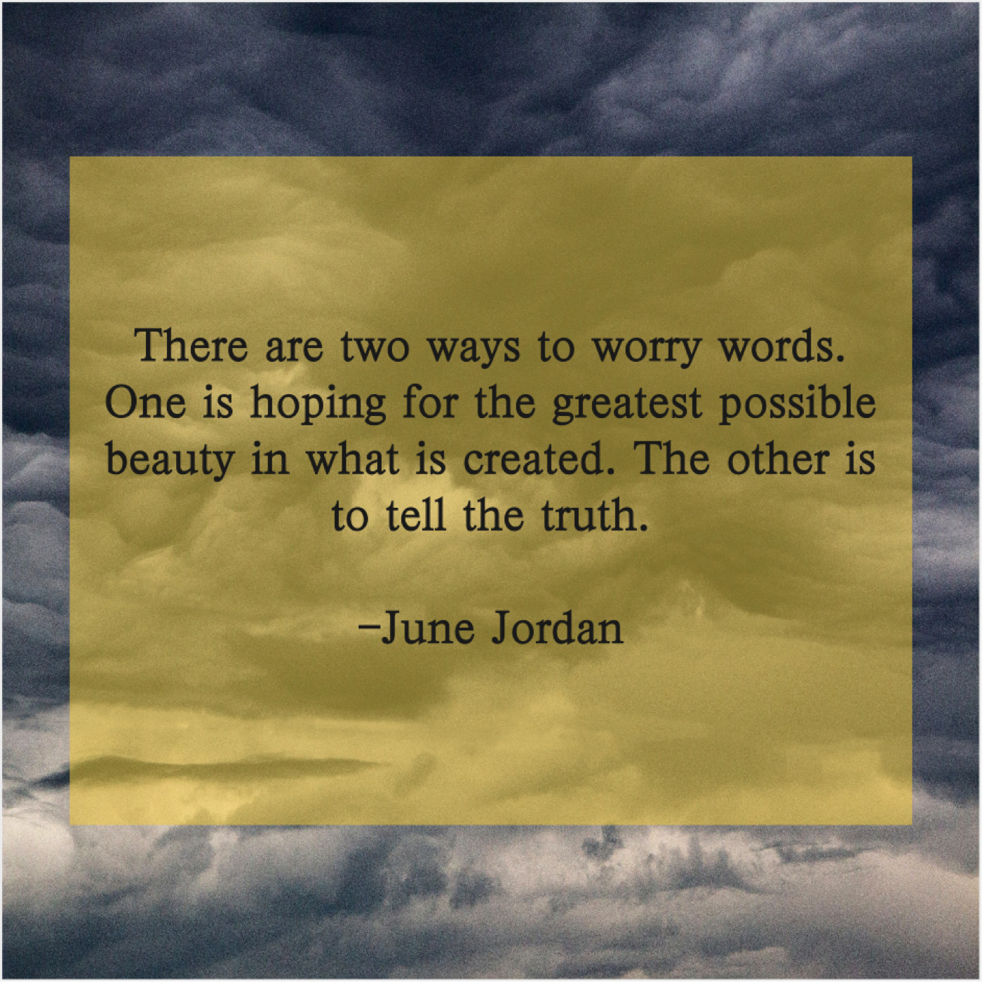 June Jordan June Jordan – There are two ways to… September 28, 2019 admin “There are two ways to worry words. One is hoping for the greatest possible beauty in what is created. The other is to tell the truth.”-June Jordan