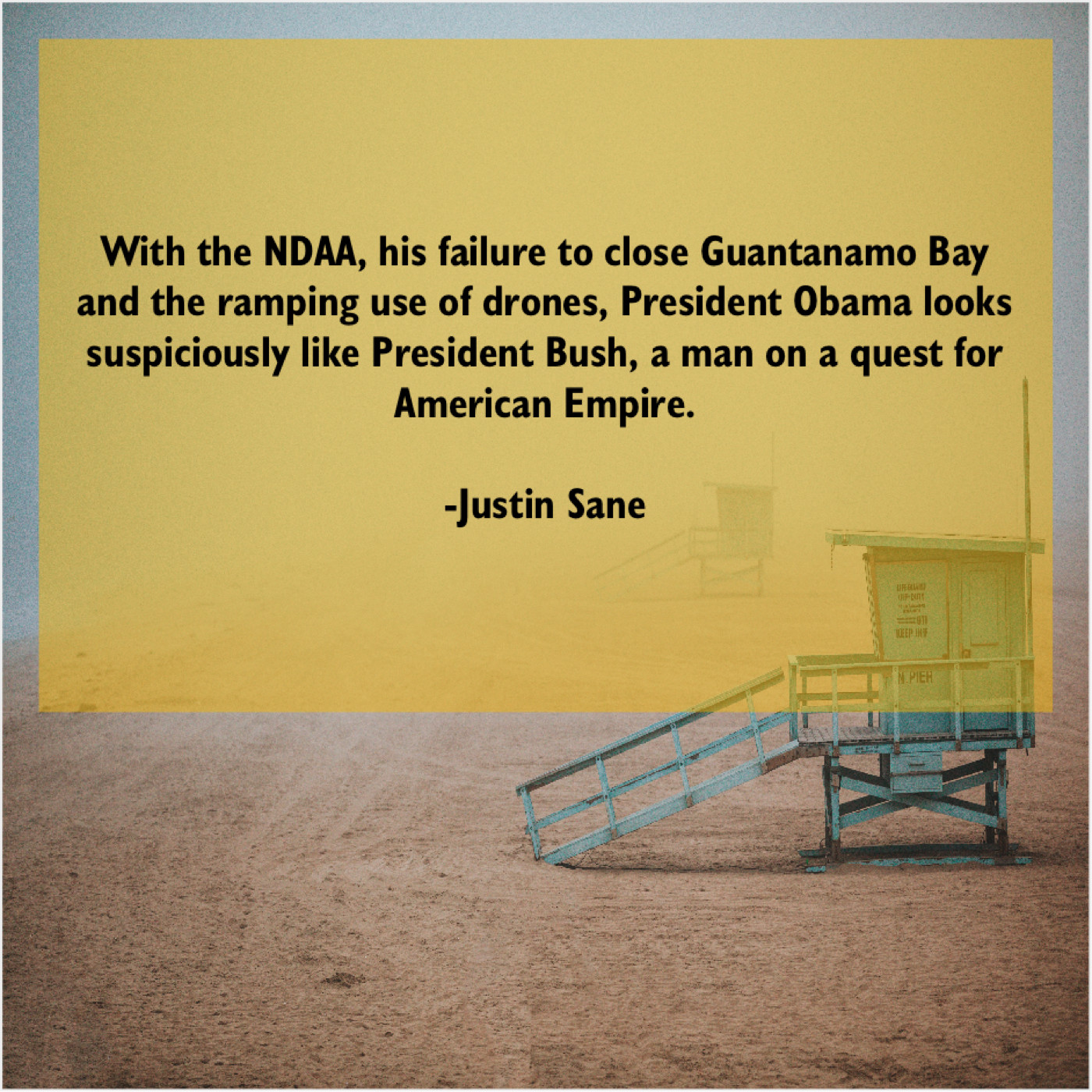 Justin Sane Justin Sane – With the NDAA, his failure… July 16, 2019 admin “With the NDAA, his failure to close Guantanamo Bay and the ramping use of drones, President Obama looks suspiciously like President Bush, a man on a quest for American Empire.”-Justin Sane