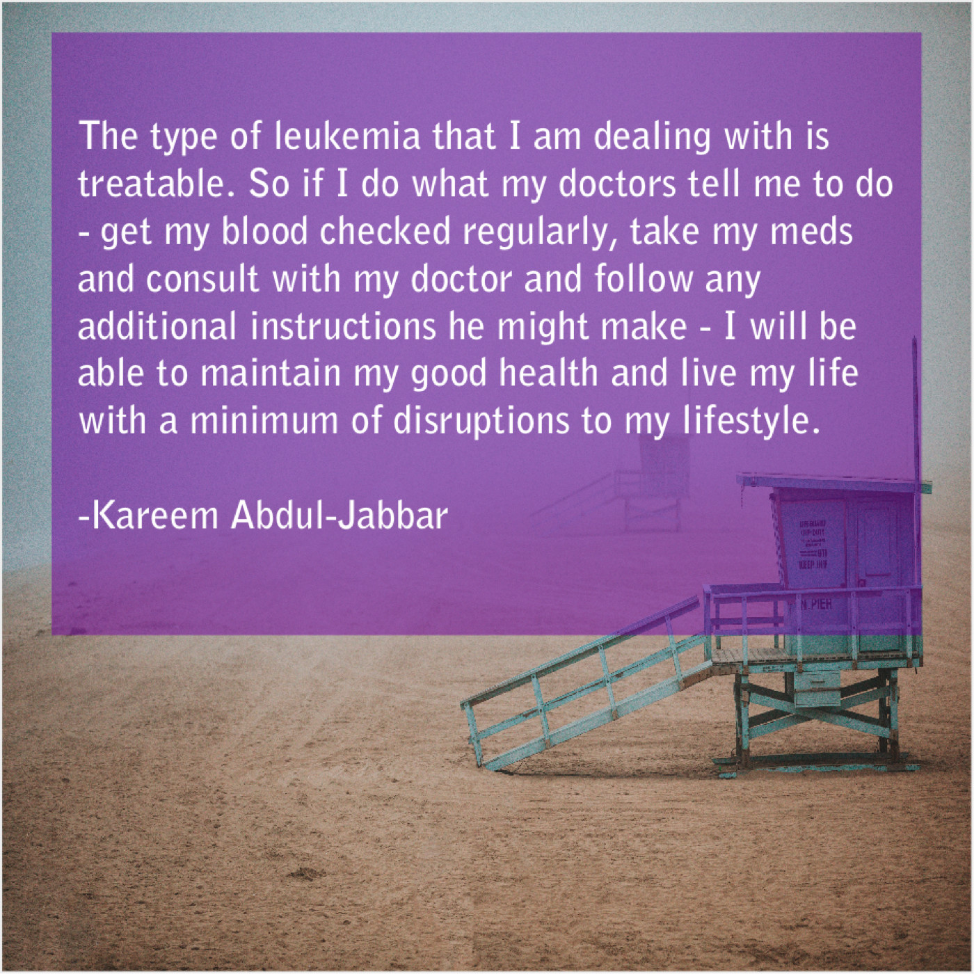 “The type of leukemia that I am dealing with is treatable. So if I do what my doctors tell me to do – get my blood checked regularly, take my meds and consult with my doctor and follow any additional instructions he might make – I will be able to maintain my good health and live my life with a minimum of disruptions to my lifestyle.”