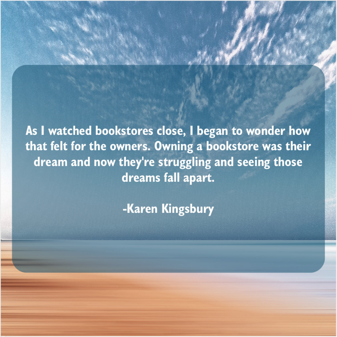 Karen Kingsbury Karen Kingsbury – As I watched bookstores close… October 8, 2019 admin “As I watched bookstores close, I began to wonder how that felt for the owners. Owning a bookstore was their dream and now they’re struggling and seeing those dreams fall apart.”-Karen Kingsbury