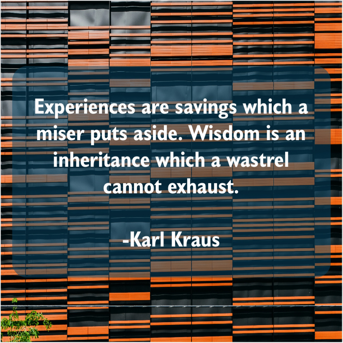Karl Kraus Karl Kraus – Experiences are savings which a… September 1, 2019 admin “Experiences are savings which a miser puts aside. Wisdom is an inheritance which a wastrel cannot exhaust.”-Karl Kraus