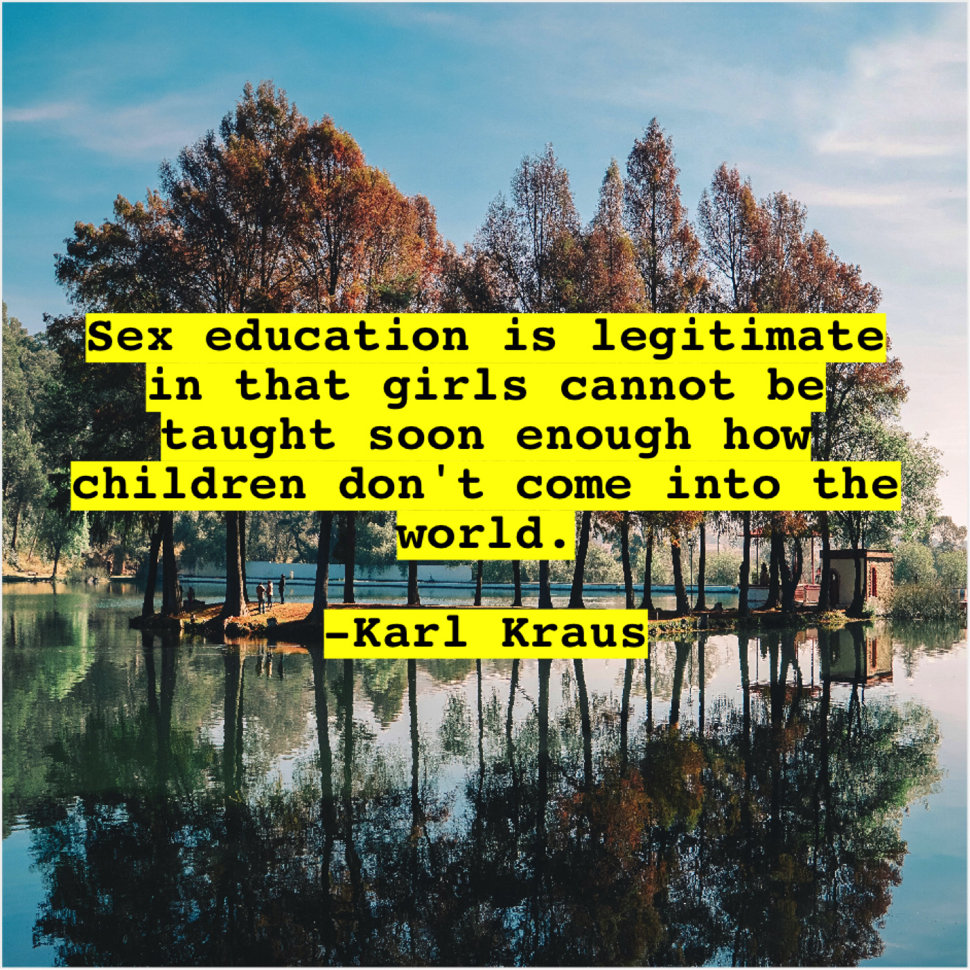 Karl Kraus Karl Kraus – Sex education is legitimate in… September 1, 2019 admin “Sex education is legitimate in that girls cannot be taught soon enough how children don’t come into the world.”-Karl Kraus