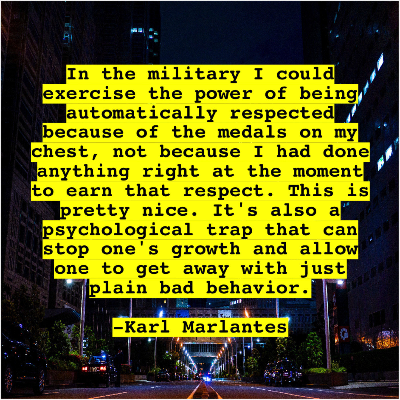 “In the military I could exercise the power of being automatically respected because of the medals on my chest, not because I had done anything right at the moment to earn that respect. This is pretty nice. It’s also a psychological trap that can stop one’s growth and allow one to get away with just plain bad behavior.”