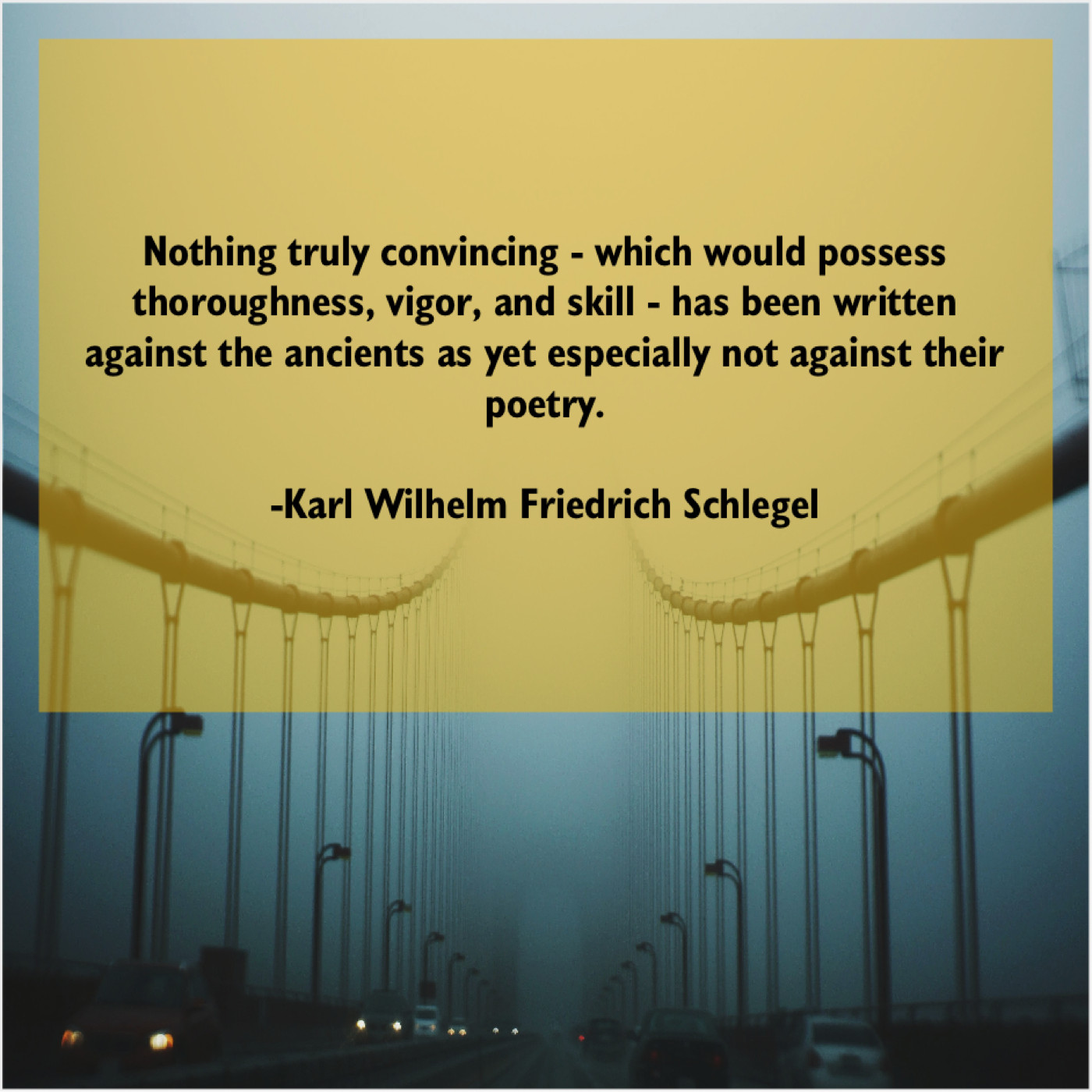 Karl Wilhelm Friedrich Schlegel Karl Wilhelm Friedrich Schlegel – Nothing truly convincing – which would… September 4, 2019 admin “Nothing truly convincing – which would possess thoroughness, vigor, and skill – has been written against the ancients as yet especially not against their poetry.”-Karl Wilhelm Friedrich Schlegel