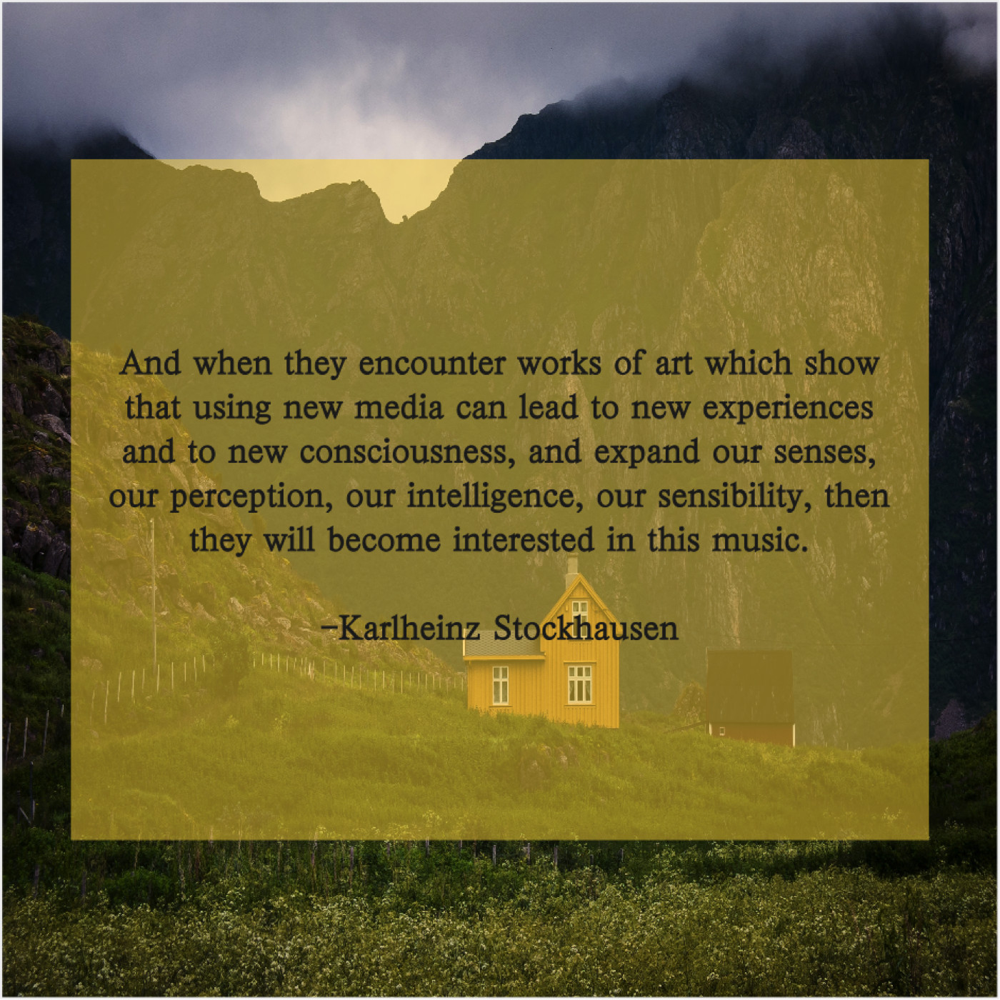 “And when they encounter works of art which show that using new media can lead to new experiences and to new consciousness, and expand our senses, our perception, our intelligence, our sensibility, then they will become interested in this music.”