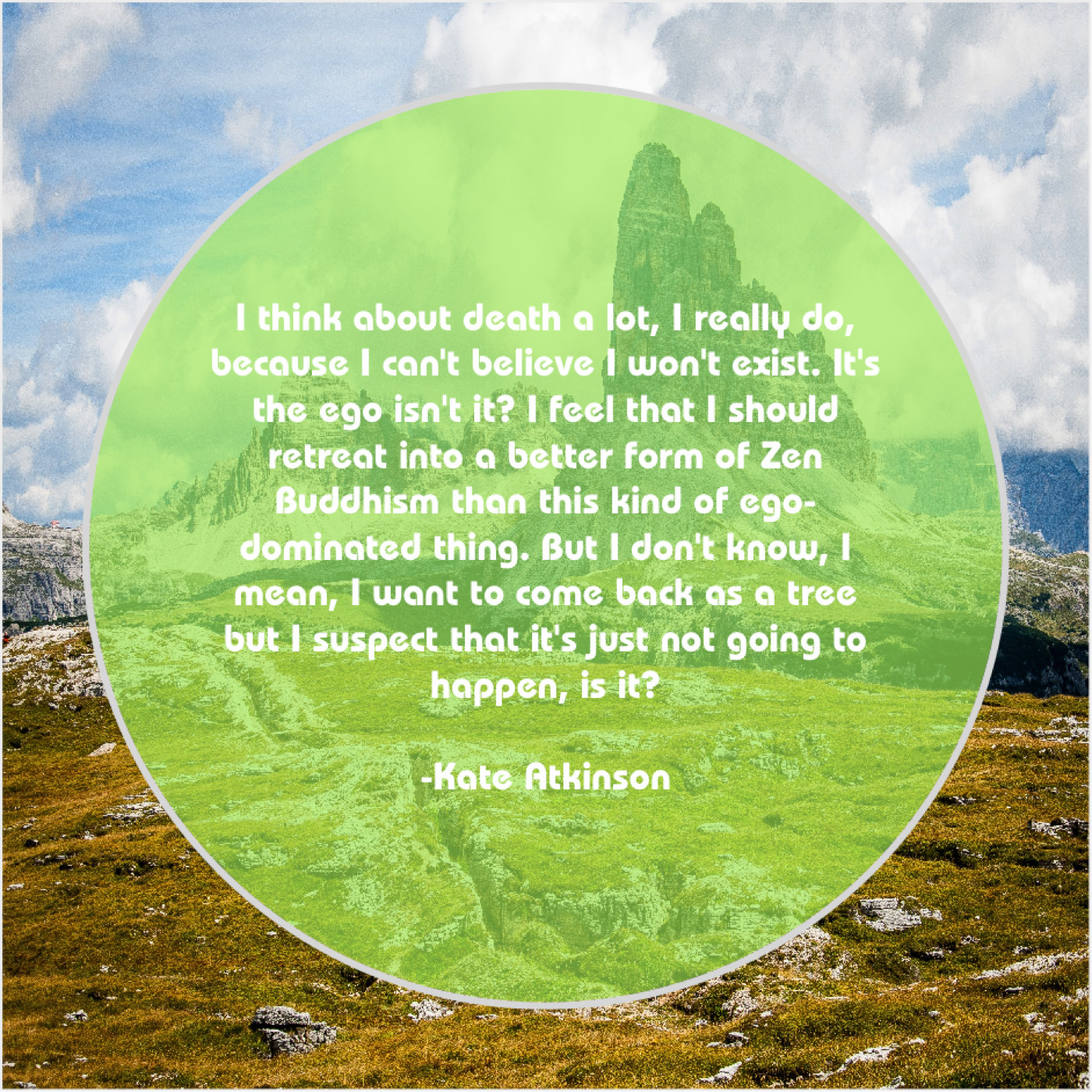 “I think about death a lot, I really do, because I can’t believe I won’t exist. It’s the ego isn’t it? I feel that I should retreat into a better form of Zen Buddhism than this kind of ego-dominated thing. But I don’t know, I mean, I want to come back as a tree but I suspect that it’s just not going to happen, is it?”