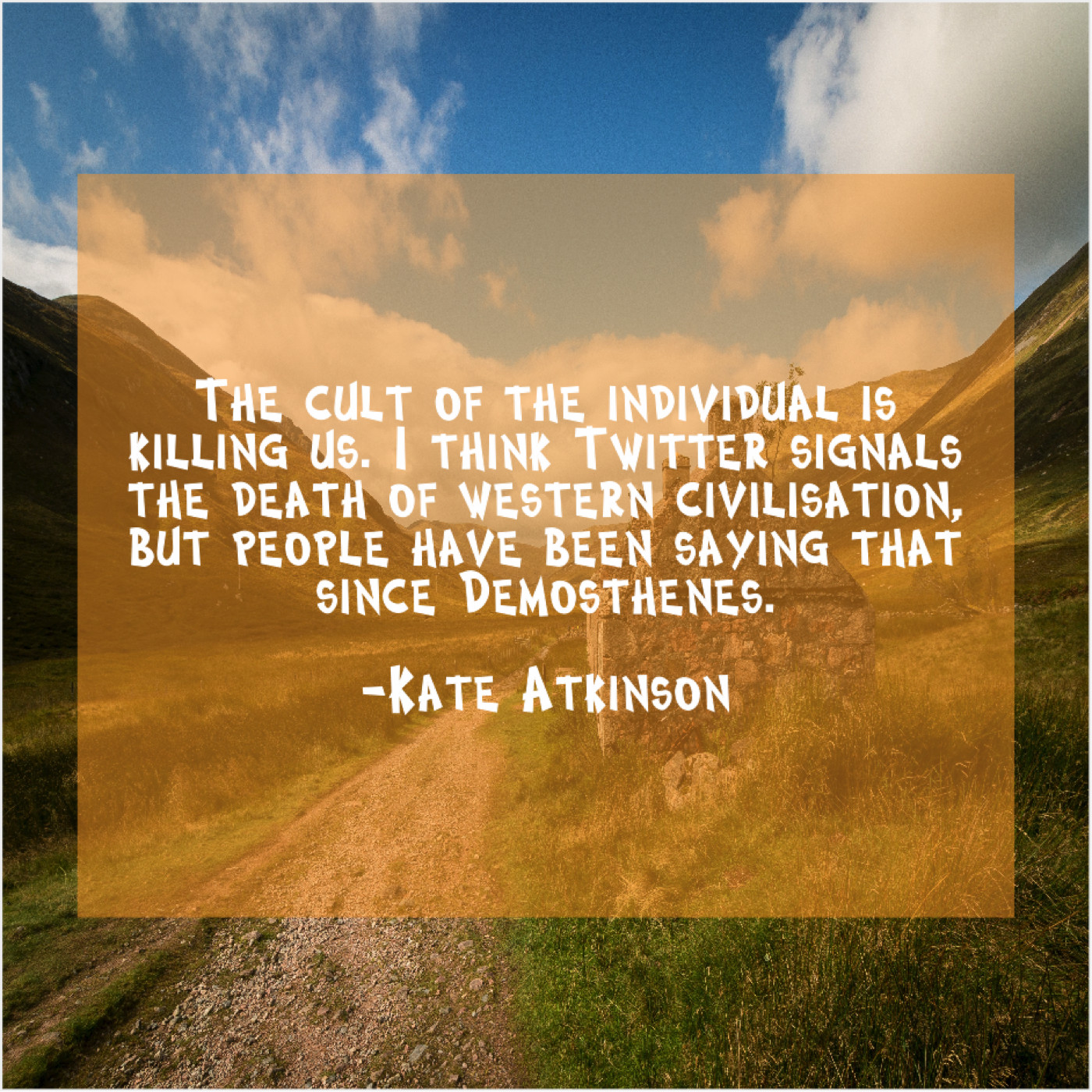 Kate Atkinson Kate Atkinson – The cult of the individual… April 5, 2019 admin “The cult of the individual is killing us. I think Twitter signals the death of western civilisation, but people have been saying that since Demosthenes.”-Kate Atkinson