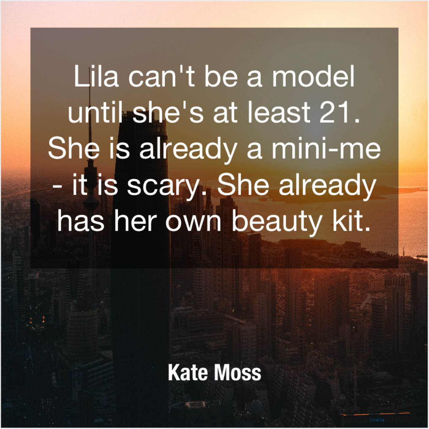 Kate Moss Kate Moss – Lila can’t be a model… August 26, 2019 admin “Lila can’t be a model until she’s at least 21. She is already a mini-me – it is scary. She already has her own beauty kit.”-Kate Moss