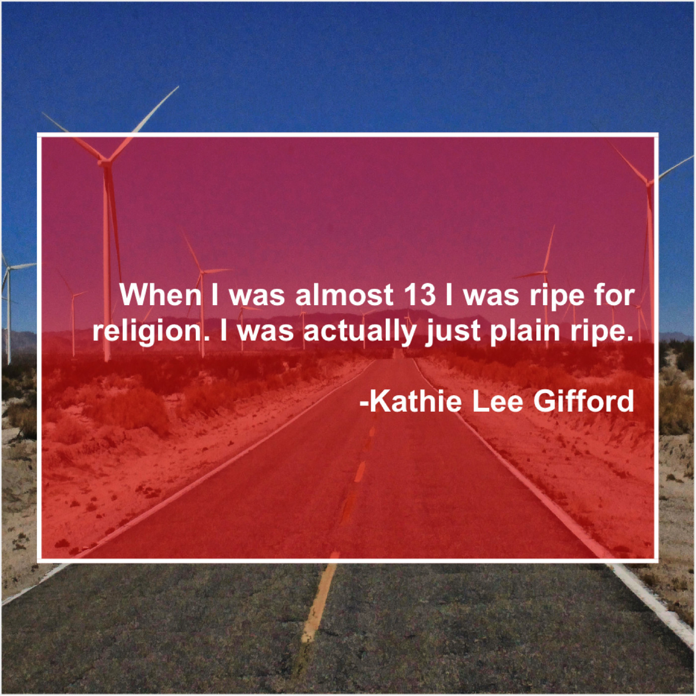 Kathie Lee Gifford Kathie Lee Gifford – When I was almost 13… December 26, 2018 admin “When I was almost 13 I was ripe for religion. I was actually just plain ripe.”-Kathie Lee Gifford