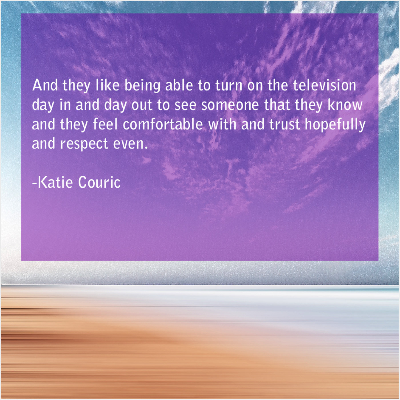 Katie Couric Katie Couric – And they like being able… September 27, 2019 admin “And they like being able to turn on the television day in and day out to see someone that they know and they feel comfortable with and trust hopefully and respect even.”-Katie Couric