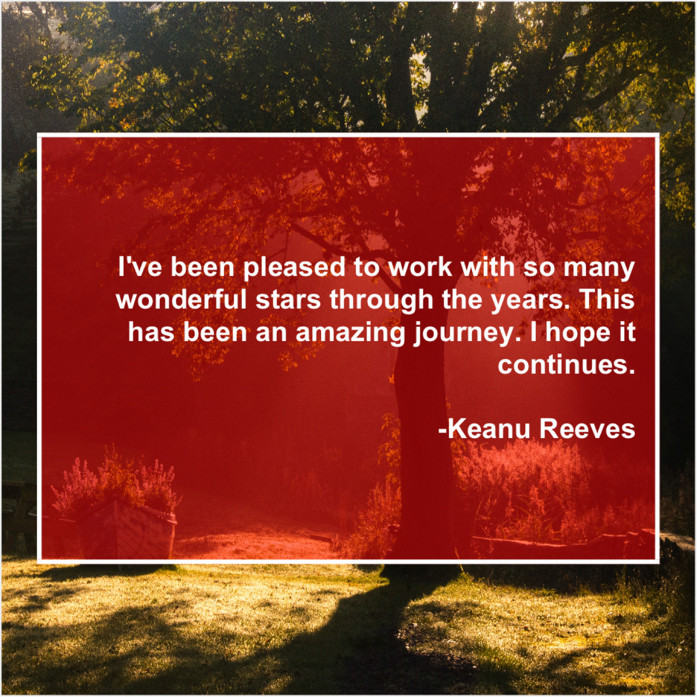Keanu Reeves Keanu Reeves – I’ve been pleased to work… December 31, 2018 admin “I’ve been pleased to work with so many wonderful stars through the years. This has been an amazing journey. I hope it continues.”-Keanu Reeves