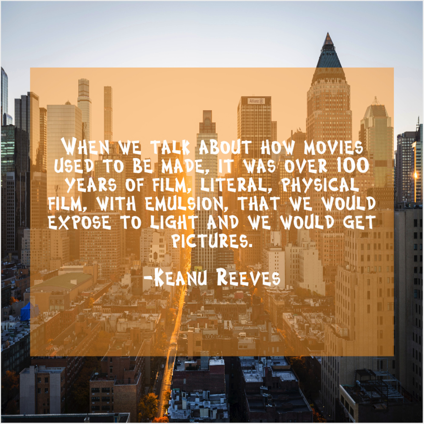 Keanu Reeves Keanu Reeves – When we talk about how… May 29, 2019 admin “When we talk about how movies used to be made, it was over 100 years of film, literal, physical film, with emulsion, that we would expose to light and we would get pictures.”-Keanu Reeves
