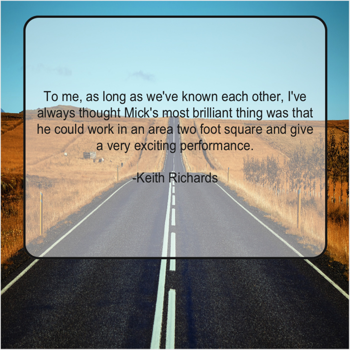 Keith Richards Keith Richards – To me, as long as… March 3, 2019 admin “To me, as long as we’ve known each other, I’ve always thought Mick’s most brilliant thing was that he could work in an area two foot square and give a very exciting performance.”-Keith Richards