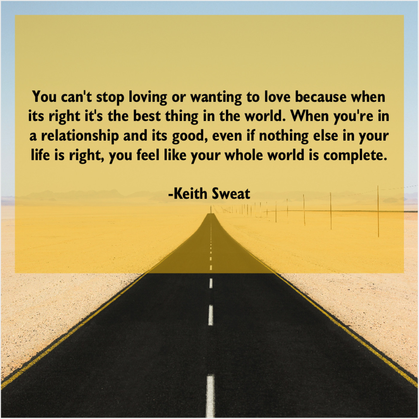 Keith Sweat Keith Sweat – You can’t stop loving or… April 28, 2019 admin “You can’t stop loving or wanting to love because when its right it’s the best thing in the world. When you’re in a relationship and its good, even if nothing else in your life is right, you feel like your whole world is complete.”-Keith Sweat