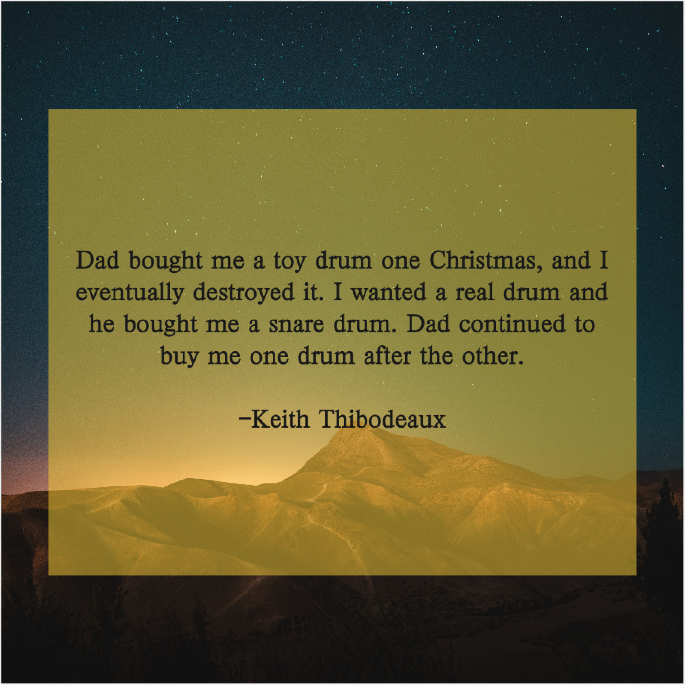 Keith Thibodeaux Keith Thibodeaux – Dad bought me a toy… April 16, 2019 admin “Dad bought me a toy drum one Christmas, and I eventually destroyed it. I wanted a real drum and he bought me a snare drum. Dad continued to buy me one drum after the other.”-Keith Thibodeaux