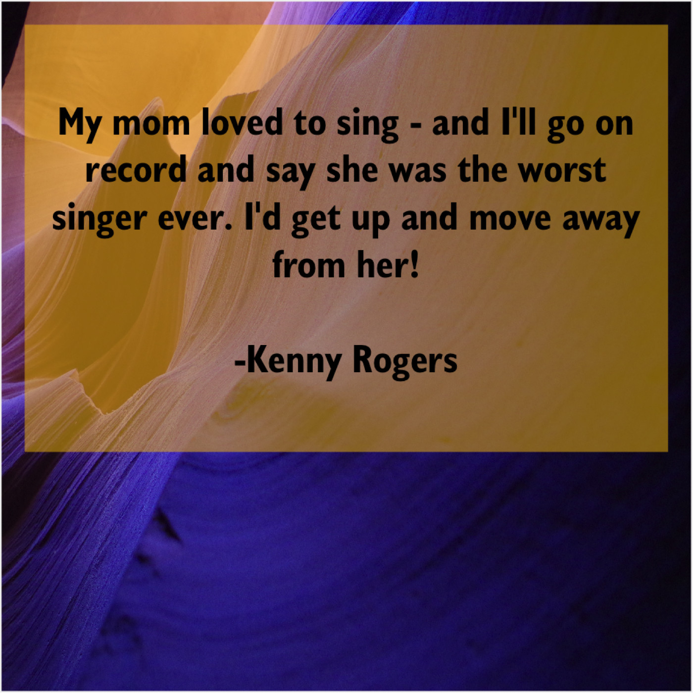 Kenny Rogers Kenny Rogers – My mom loved to sing… October 3, 2019 admin “My mom loved to sing – and I’ll go on record and say she was the worst singer ever. I’d get up and move away from her!”-Kenny Rogers