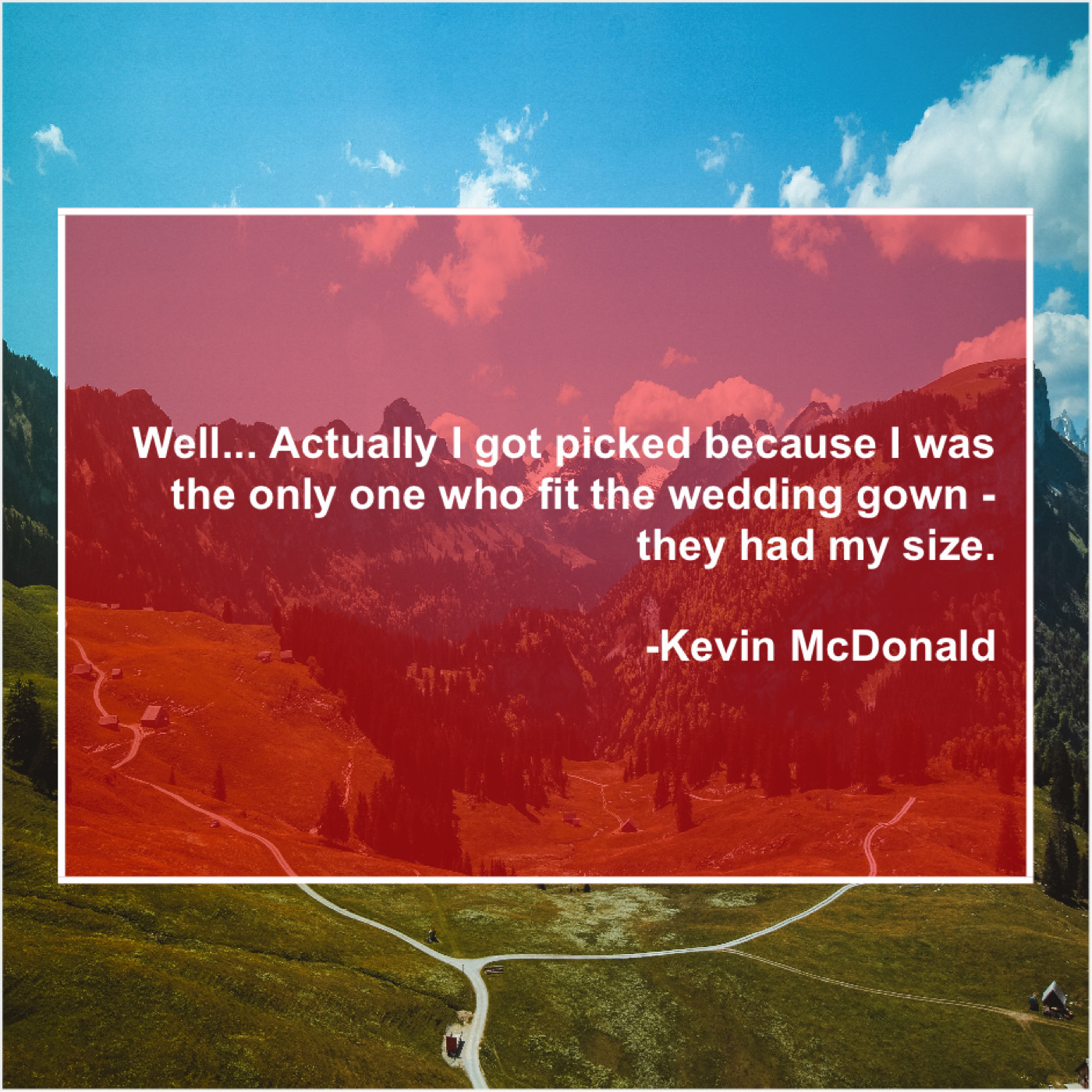 Kevin McDonald Kevin McDonald – Well… Actually I got picked… January 14, 2019 admin “Well… Actually I got picked because I was the only one who fit the wedding gown – they had my size.”-Kevin McDonald