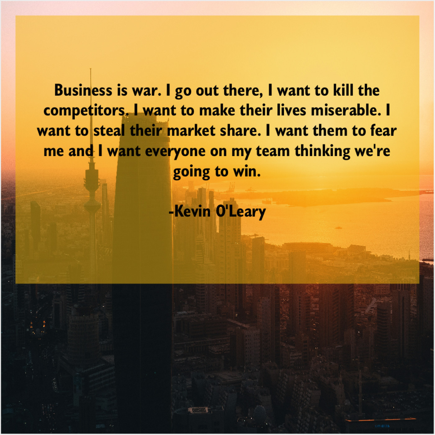 Kevin O'Leary Kevin O’Leary – Business is war. I go… July 5, 2019 admin “Business is war. I go out there, I want to kill the competitors. I want to make their lives miserable. I want to steal their market share. I want them to fear me and I want everyone on my team thinking we’re going to win.”-Kevin O’Leary