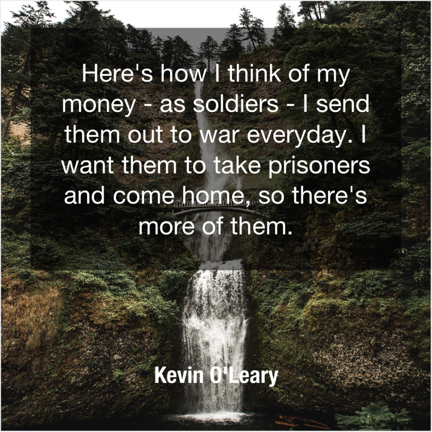 Kevin O'Leary Kevin O’Leary – Here’s how I think of… November 28, 2018 admin “Here’s how I think of my money – as soldiers – I send them out to war everyday. I want them to take prisoners and come home, so there’s more of them.”-Kevin O’Leary