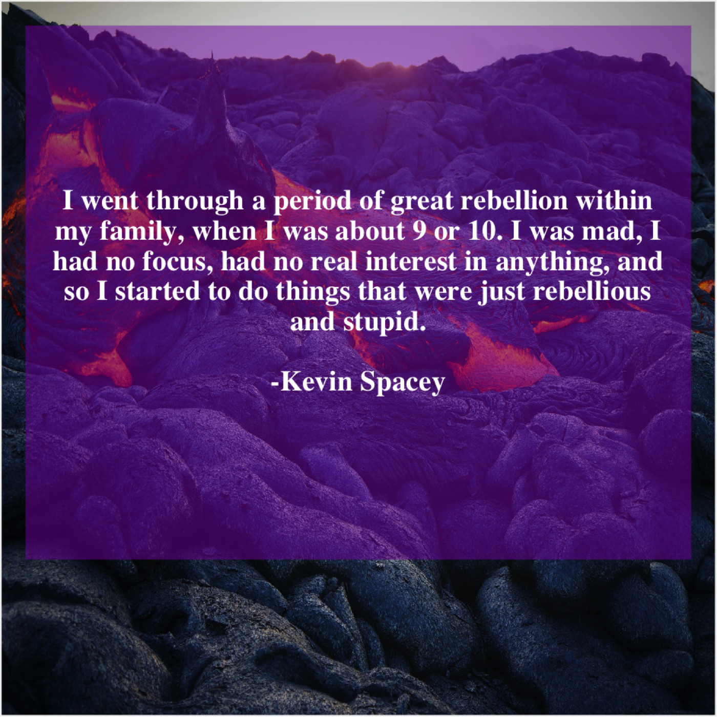 Kevin Spacey Kevin Spacey – I went through a period… July 7, 2019 admin “I went through a period of great rebellion within my family, when I was about 9 or 10. I was mad, I had no focus, had no real interest in anything, and so I started to do things that were just rebellious and stupid.”-Kevin Spacey