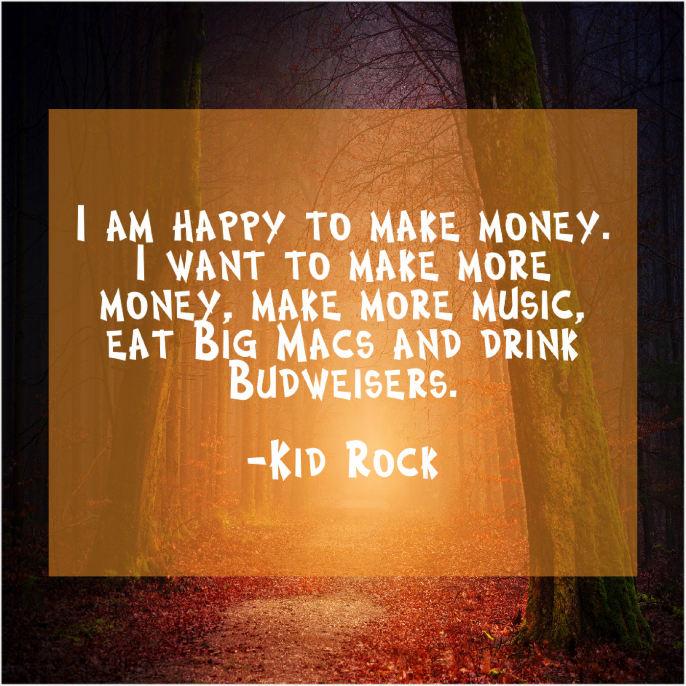 Kid Rock Kid Rock – I am happy to make… March 23, 2019 admin “I am happy to make money. I want to make more money, make more music, eat Big Macs and drink Budweisers.”-Kid Rock