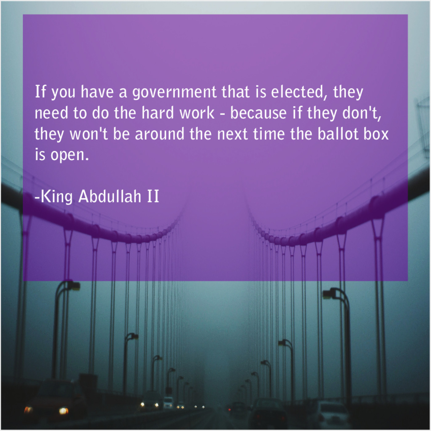 King Abdullah II King Abdullah II – If you have a government… January 22, 2019 admin “If you have a government that is elected, they need to do the hard work – because if they don’t, they won’t be around the next time the ballot box is open.”-King Abdullah II