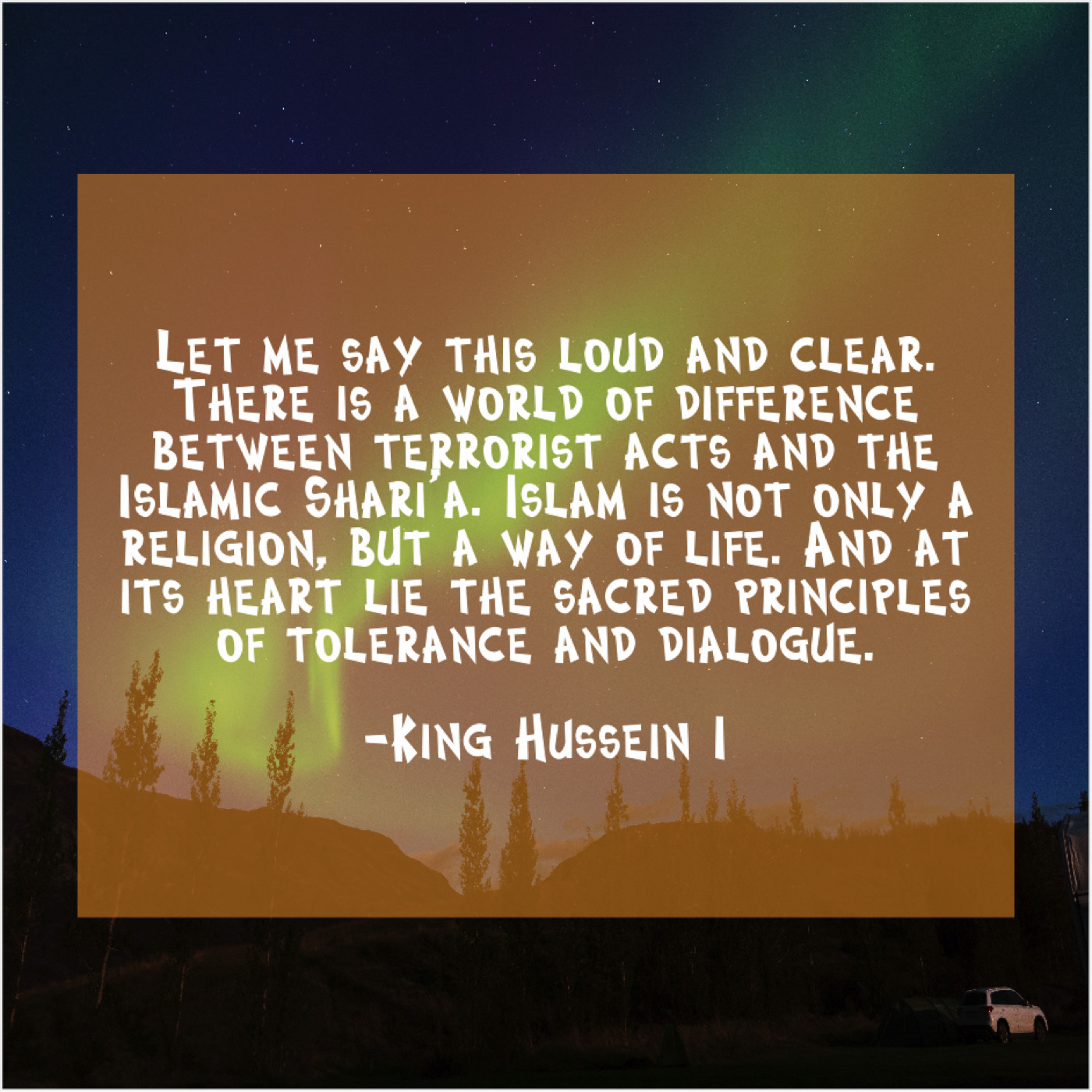 King Hussein I King Hussein I – Let me say this loud… January 26, 2019 admin “Let me say this loud and clear. There is a world of difference between terrorist acts and the Islamic Shari’a. Islam is not only a religion, but a way of life. And at its heart lie the sacred principles of tolerance and dialogue.”-King Hussein I