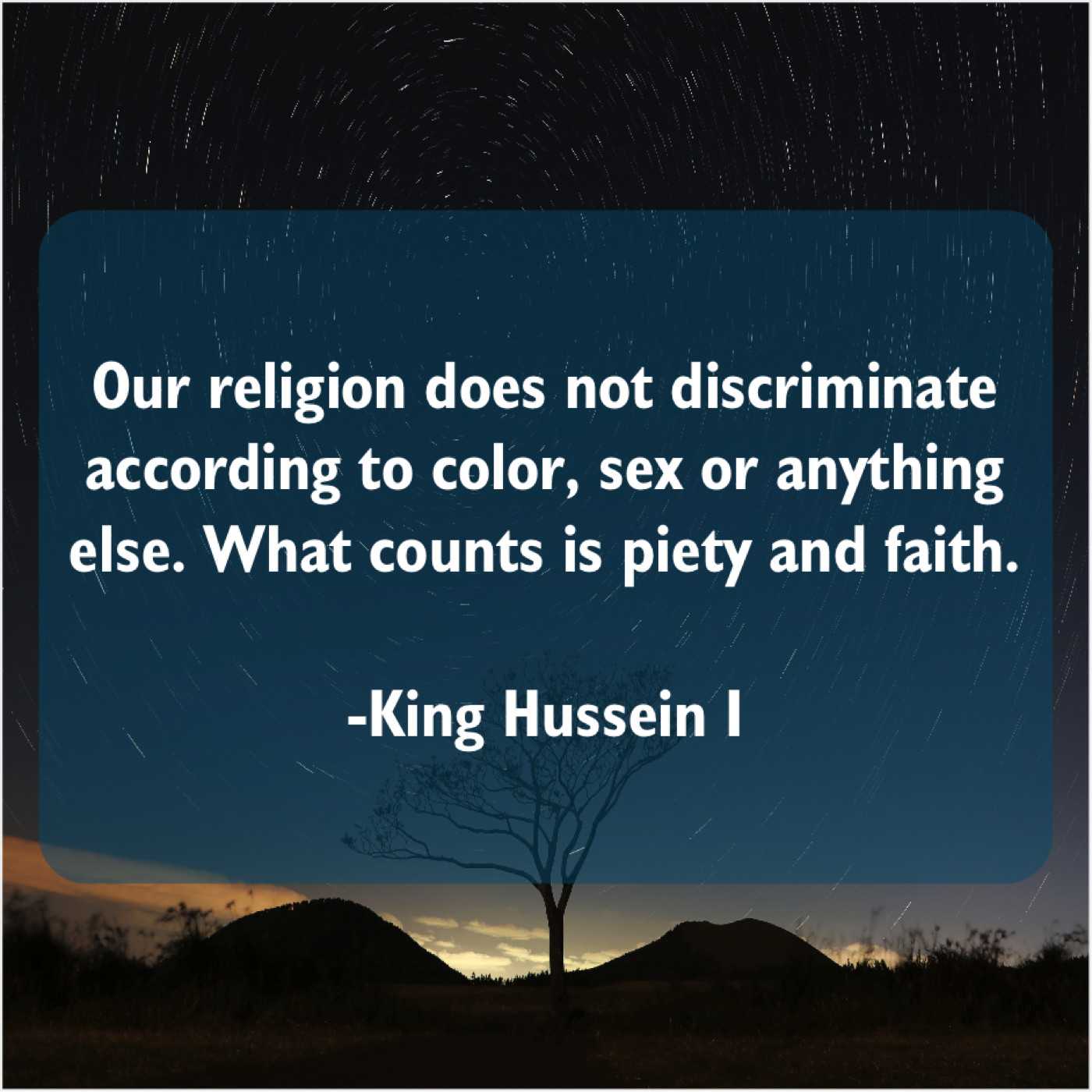 King Hussein I King Hussein I – Our religion does not discriminate… August 6, 2019 admin “Our religion does not discriminate according to color, sex or anything else. What counts is piety and faith.”-King Hussein I