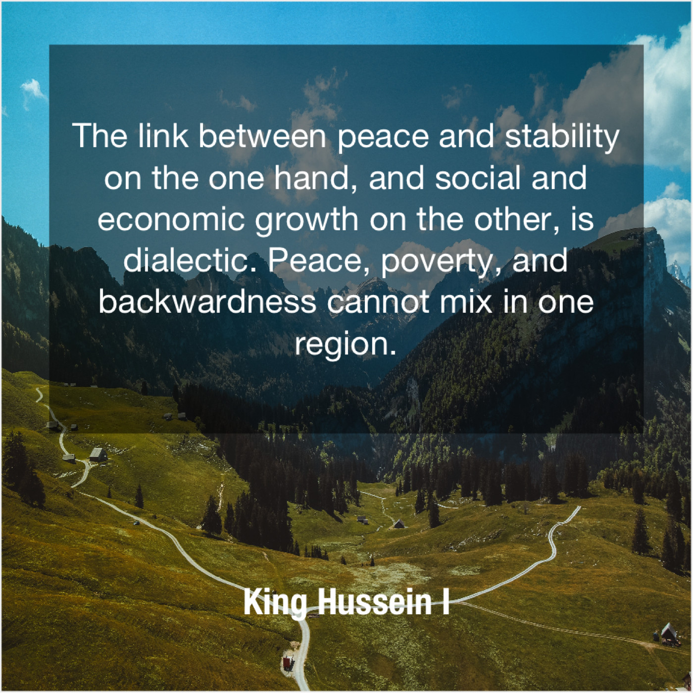 King Hussein I King Hussein I – The link between peace and… January 2, 2019 admin “The link between peace and stability on the one hand, and social and economic growth on the other, is dialectic. Peace, poverty, and backwardness cannot mix in one region.”-King Hussein I