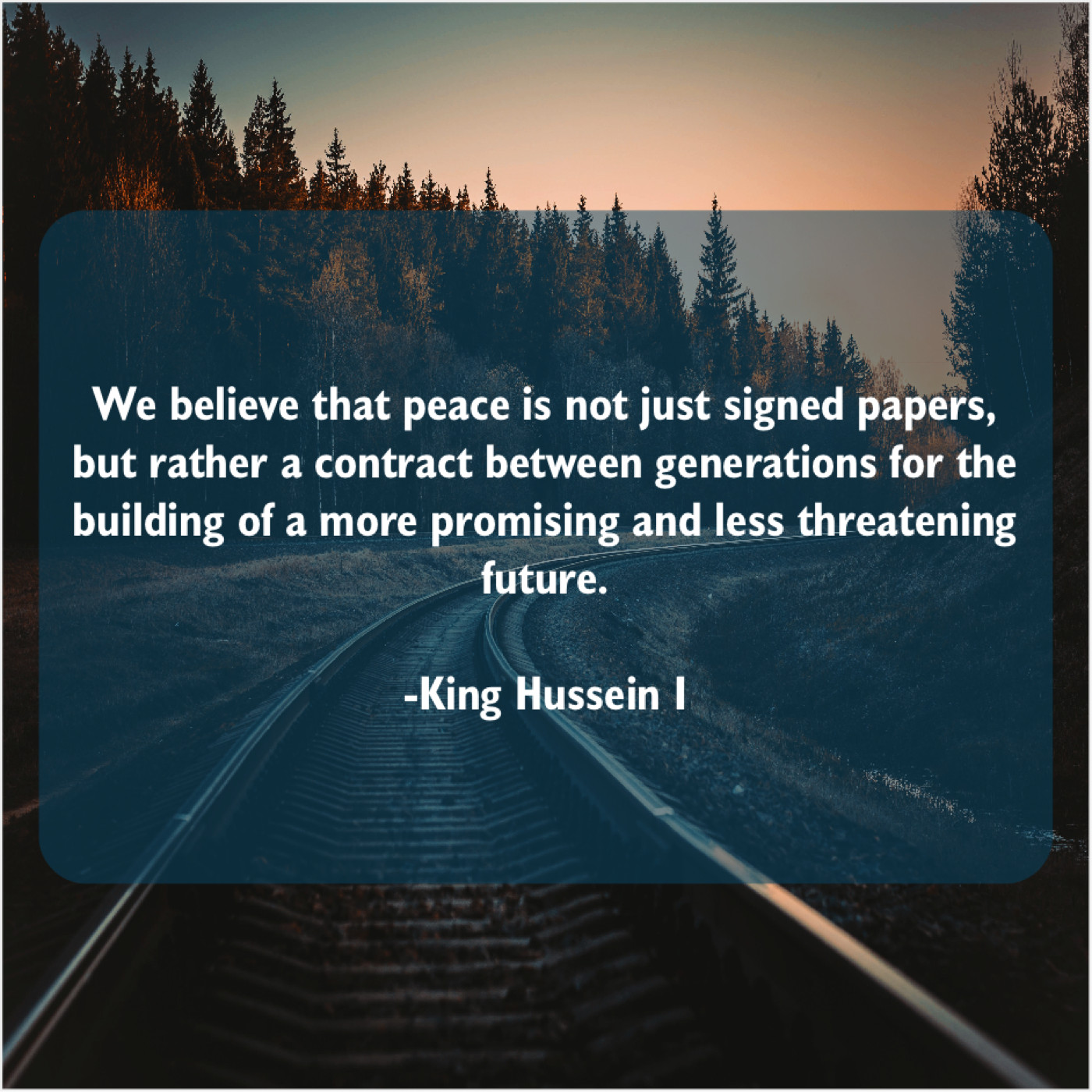 King Hussein I King Hussein I – We believe that peace is… October 15, 2019 admin “We believe that peace is not just signed papers, but rather a contract between generations for the building of a more promising and less threatening future.”-King Hussein I