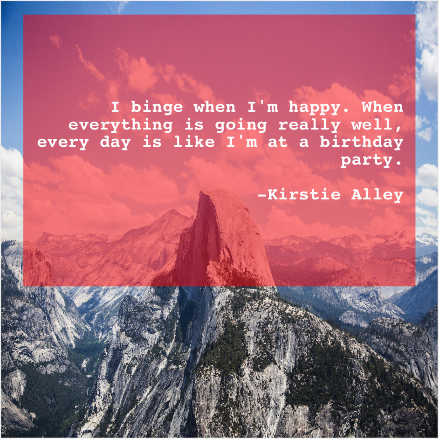 Kirstie Alley Kirstie Alley – I binge when I’m happy… December 15, 2018 admin “I binge when I’m happy. When everything is going really well, every day is like I’m at a birthday party.”-Kirstie Alley