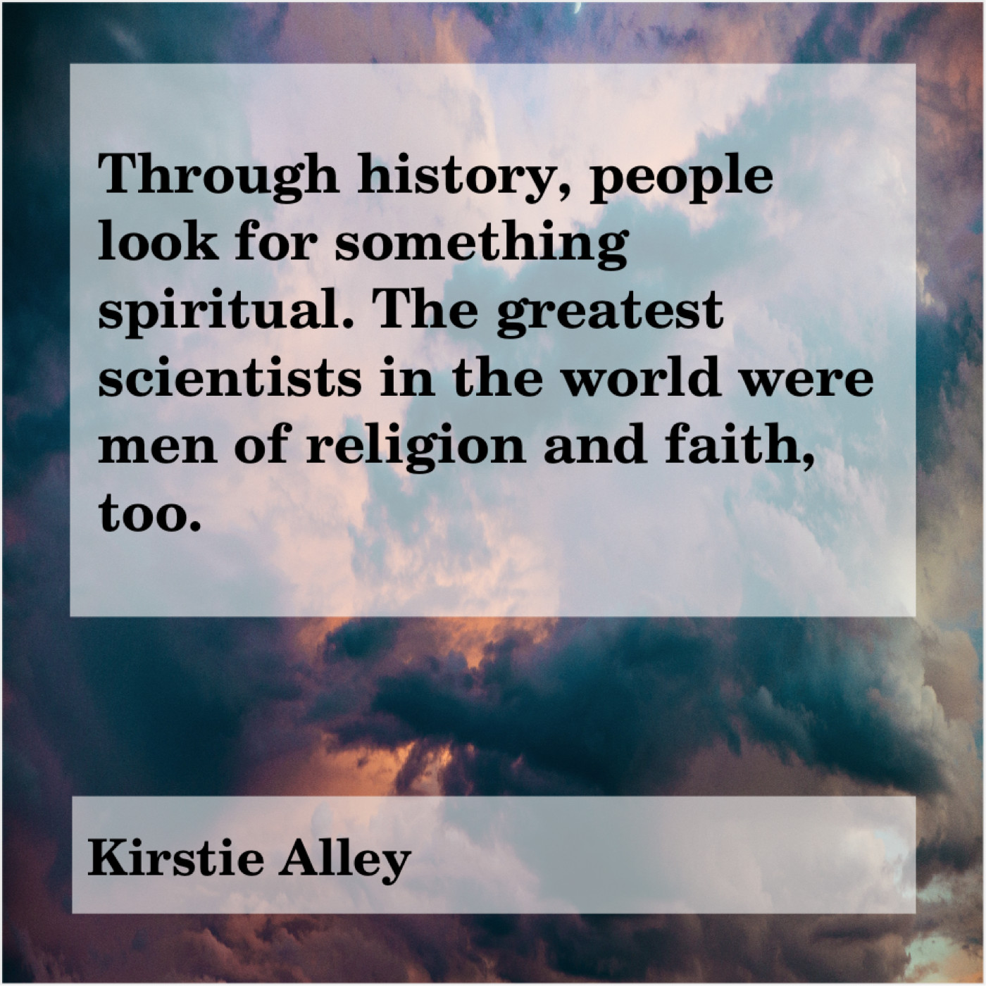 Kirstie Alley Kirstie Alley – Through history, people look for… February 19, 2019 admin “Through history, people look for something spiritual. The greatest scientists in the world were men of religion and faith, too.”-Kirstie Alley