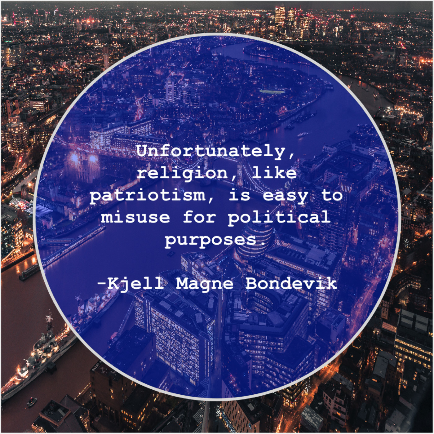Kjell Magne Bondevik Kjell Magne Bondevik – Unfortunately, religion, like patriotism, is… June 15, 2019 admin “Unfortunately, religion, like patriotism, is easy to misuse for political purposes.”-Kjell Magne Bondevik