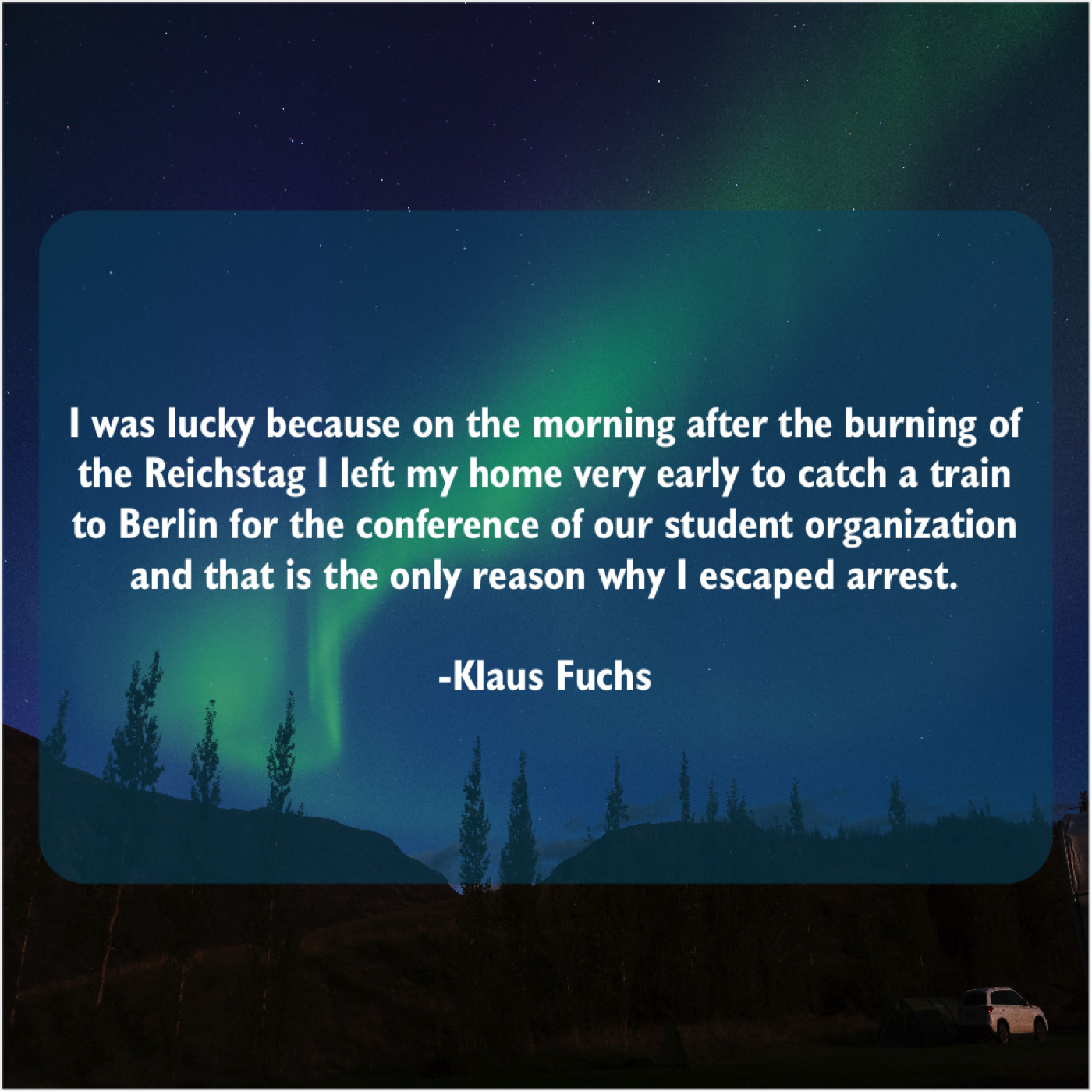 Klaus Fuchs Klaus Fuchs – I was lucky because on… November 16, 2018 admin “I was lucky because on the morning after the burning of the Reichstag I left my home very early to catch a train to Berlin for the conference of our student organization and that is the only reason why I escaped arrest.”-Klaus Fuchs