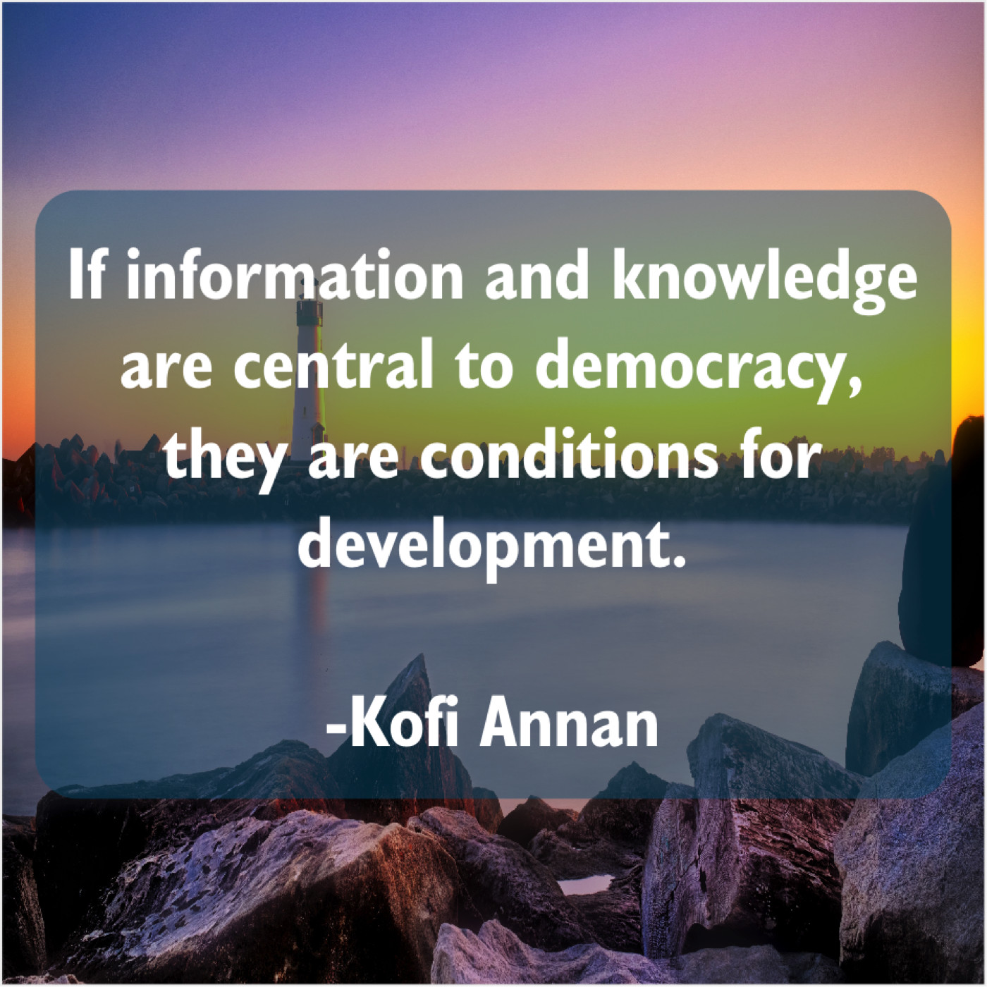 Kofi Annan Kofi Annan – If information and knowledge are… May 24, 2019 admin “If information and knowledge are central to democracy, they are conditions for development.”-Kofi Annan