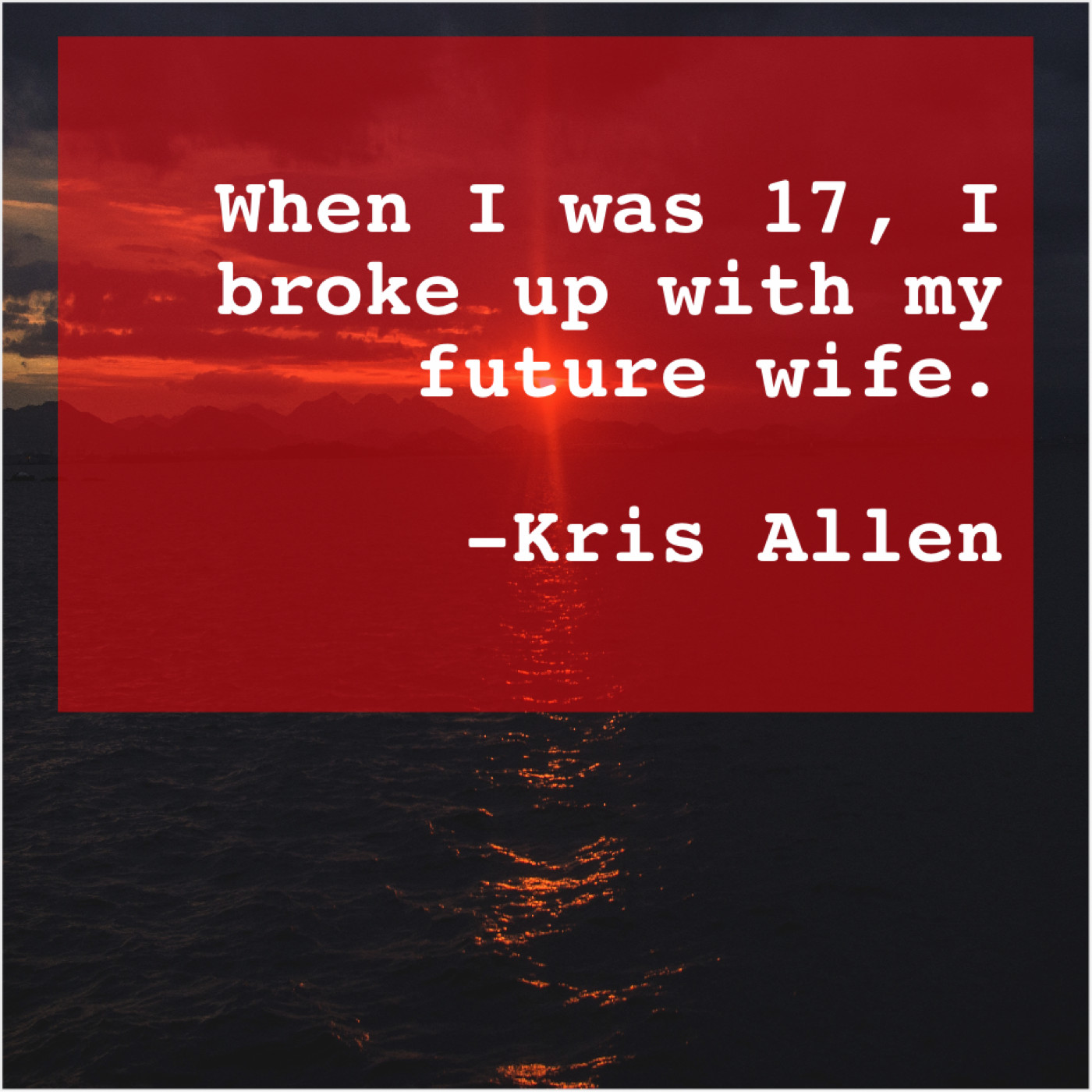 Kris Allen Kris Allen – When I was 17, I… May 4, 2019 admin “When I was 17, I broke up with my future wife.”-Kris Allen