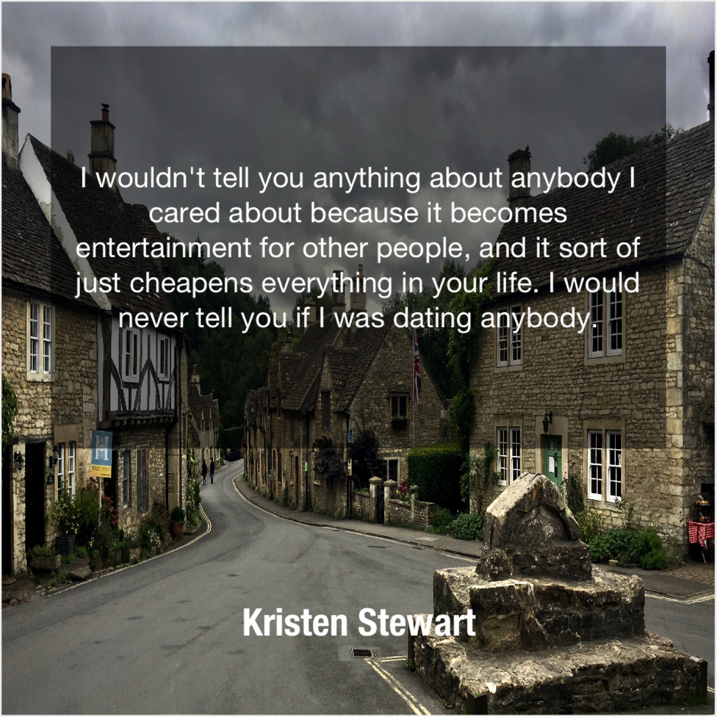 Kristen Stewart Kristen Stewart – I wouldn’t tell you anything… June 20, 2019 admin “I wouldn’t tell you anything about anybody I cared about because it becomes entertainment for other people, and it sort of just cheapens everything in your life. I would never tell you if I was dating anybody.”-Kristen Stewart