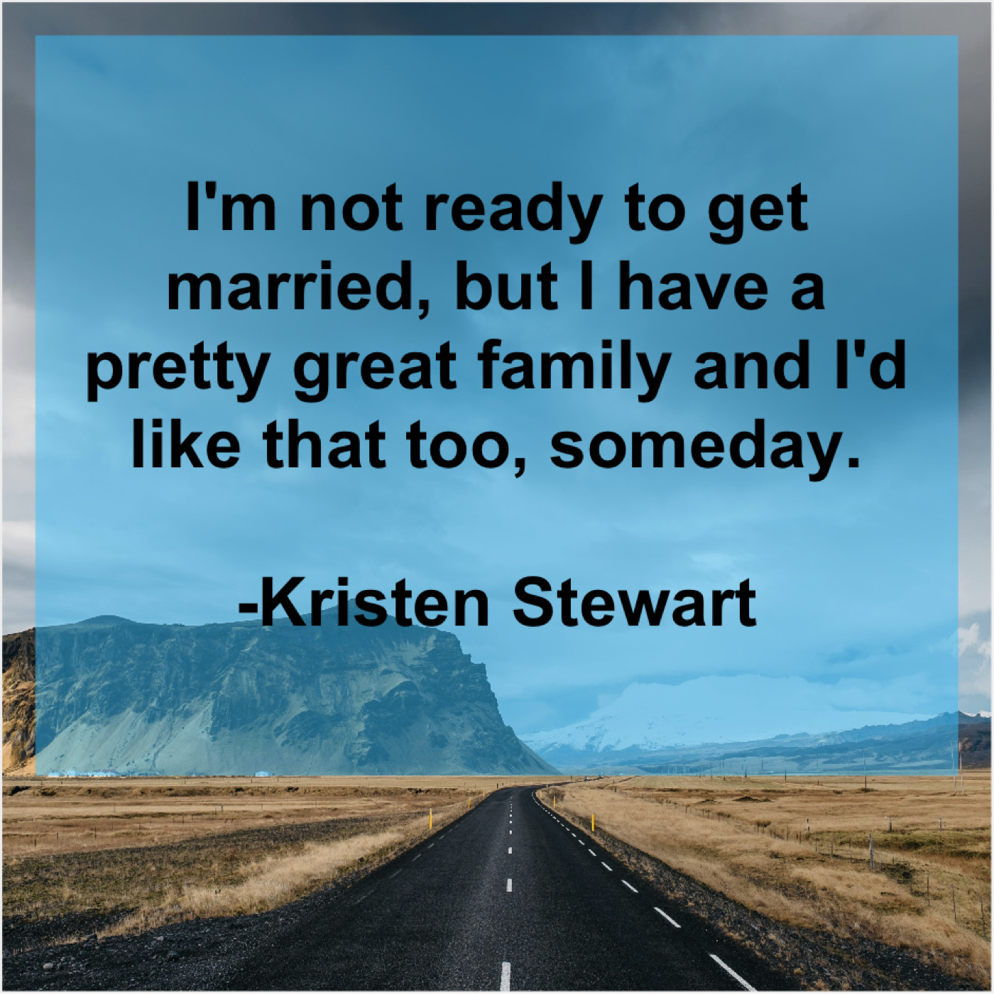 Kristen Stewart Kristen Stewart – I’m not ready to get… March 18, 2019 admin “I’m not ready to get married, but I have a pretty great family and I’d like that too, someday.”-Kristen Stewart