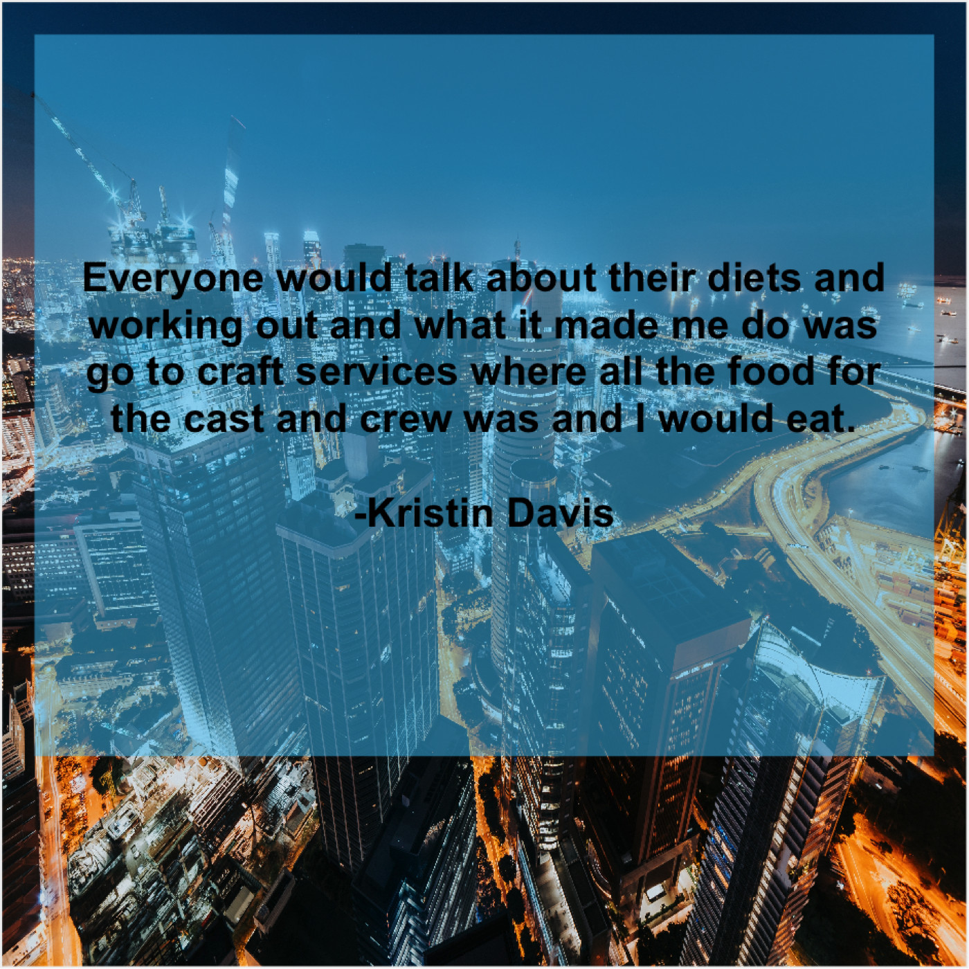 Kristin Davis Kristin Davis – Everyone would talk about their… November 17, 2018 admin “Everyone would talk about their diets and working out and what it made me do was go to craft services where all the food for the cast and crew was and I would eat.”-Kristin Davis