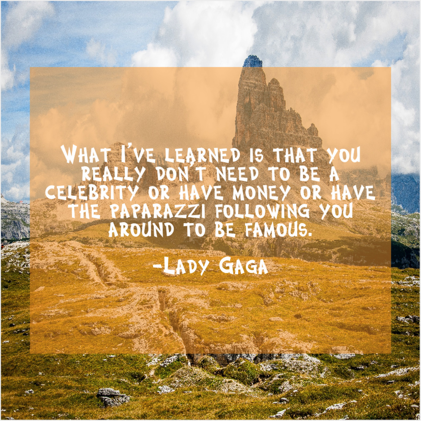 Lady Gaga Lady Gaga – What I’ve learned is that… April 14, 2019 admin “What I’ve learned is that you really don’t need to be a celebrity or have money or have the paparazzi following you around to be famous.”-Lady Gaga